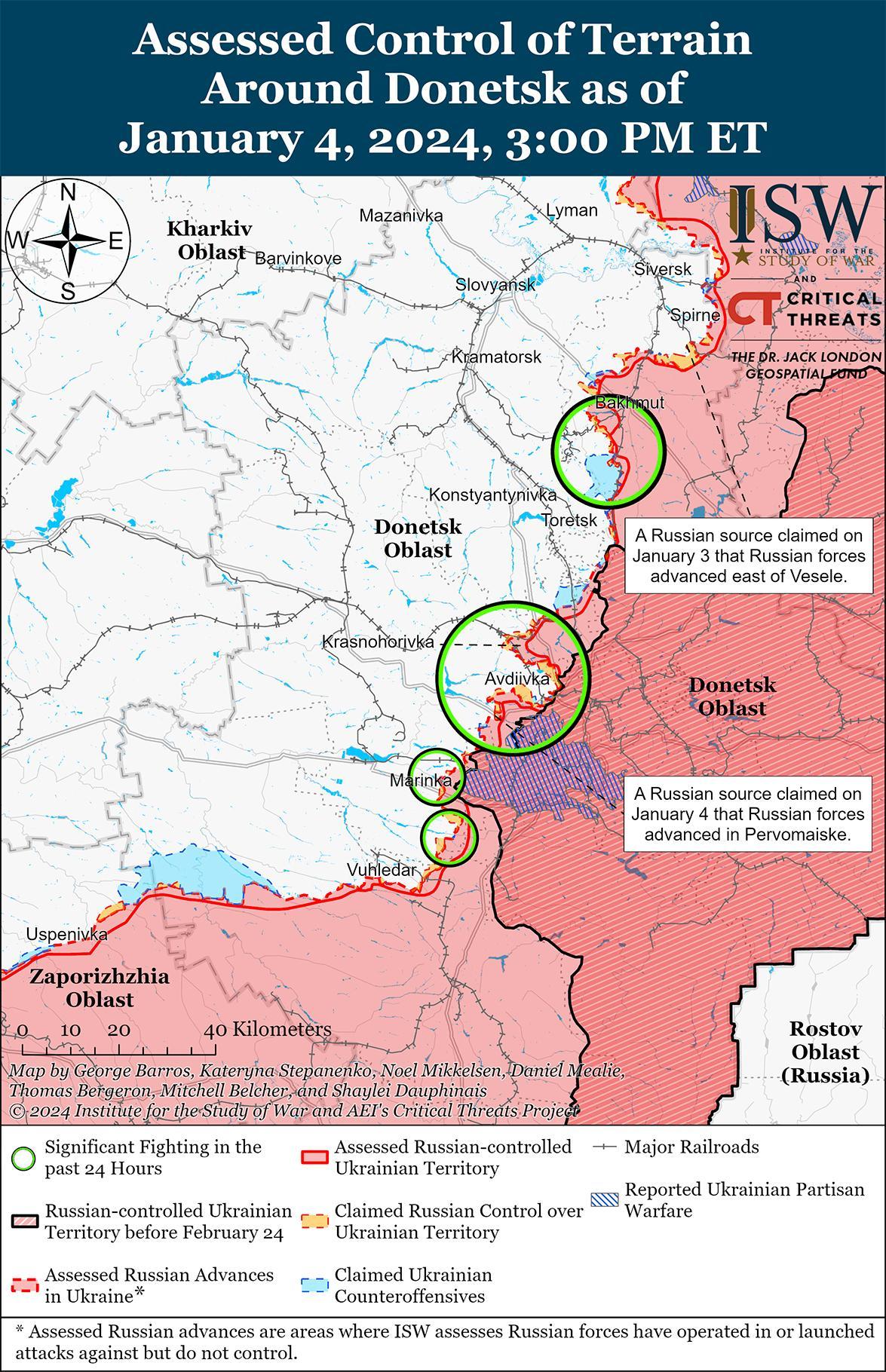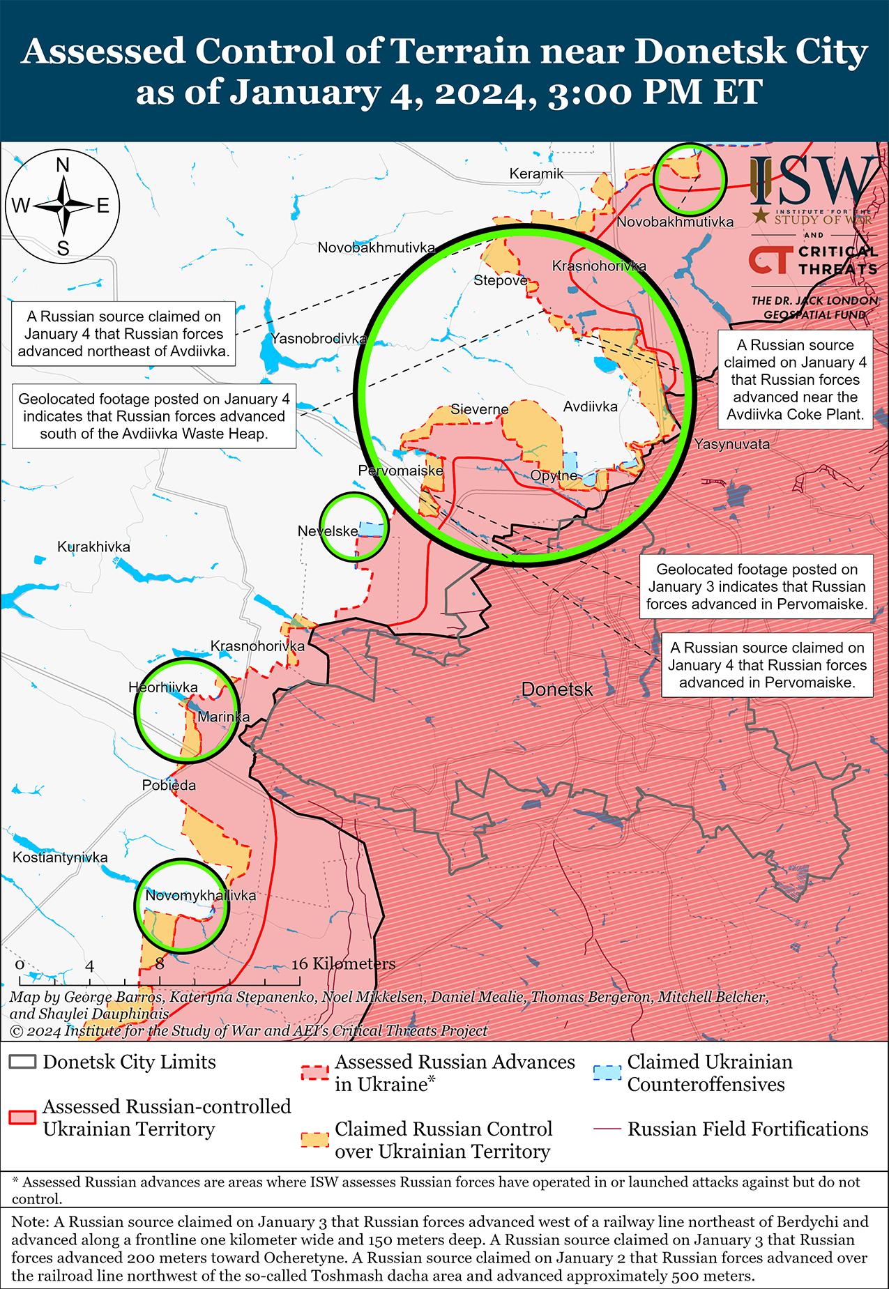 Недавно российские войска продвинулись в районе Авдеевки и, как сообщается, активизировали позиционные бои с украинскими силами в этом районе 4 января. Геолоцированные кадры, опубликованные 4 января, свидетельствуют о том, что российские войска недавно продвинулись в районе Авдеевского полигона (к северо-востоку от Авдеевки). [44] Российский блогер утверждал, что российские войска продвинулись на дачных участках к юго-востоку от Авдеевского террикона. [45] 3 января другой российский блогер заявил, что российские войска продвинулись к северо-востоку от Бердичей (северо-запад от Авдеевки) и на 150 метров в глубину к северо-востоку от Бердичи (северо-запад от Авдеевки) и на 200 метров в глубину. [46] ISW не обнаружил визуального подтверждения этих утверждений. 4 января российские и украинские источники сообщили, что позиционные бои продолжались северо-западнее Авдеевки в районах населенных пунктов Новобахмутовка, Бердичи и Степное; вблизи Авдеевского коксохимического завода на северо-западе Авдеевки; на северо-восточной и юго-восточной окраинах Авдеевки; к югу от Авдеевки в районе Опытного; юго-западнее Авдеевки в районе Водяного, Первомайского и Невельского; и западнее Авдеевки в районе Тоненького. [47] Командующий украинской Таврийской группировкой войск бригадный генерал Александр Тарнавский заявил, что за прошедшие сутки российские войска почти вдвое увеличили интенсивность наземных обстрелов. [48] Глава украинской Авдеевской городской военной администрации Виталий Барабаш заявил, что российские войска в первую очередь атакуют Степное, пытаясь нарушить украинские наземные линии коммуникаций (НЛК), но украинские силы по-прежнему сохраняют контроль над населенным пунктом. [49]
