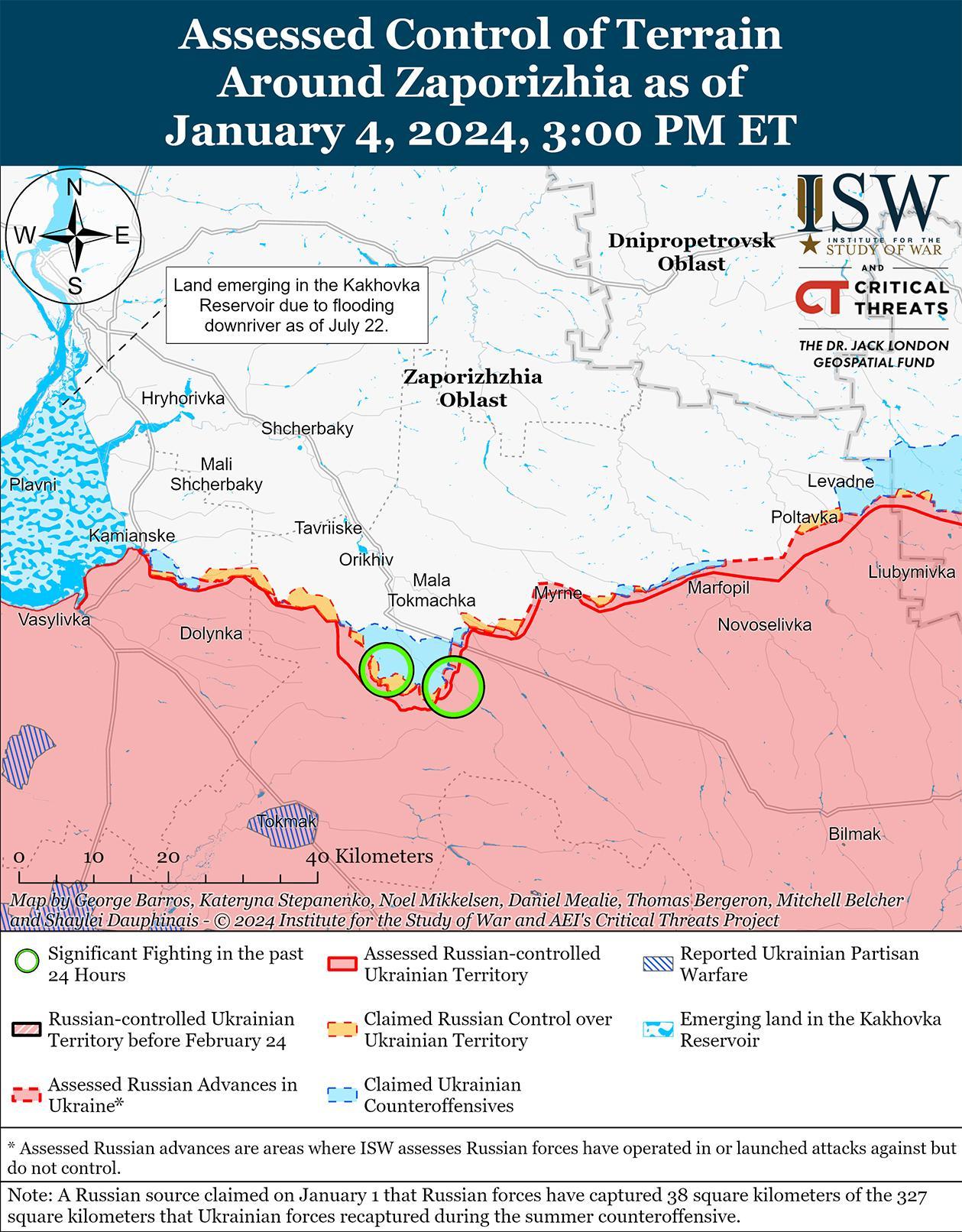 4 января российские и украинские войска продолжили позиционные бои на западе Запорожской области, однако подтвержденных изменений линии фронта на этом участке не было. Российские и украинские военные констатировали, что продолжаются позиционные бои вблизи Вербового (к востоку от Роботино), Роботино и Новопрокоповки (к югу от Роботино). [54] Сообщается, что на Запорожском направлении продолжают действовать подразделения российской 42-й мотострелковой дивизии (58-я общевойсковая армия, Южный военный округ). [55] Сообщается, что подразделения российского 108-го парашютно-десантного полка (7-й дивизии ВДВ) продолжают действовать в районе Вербового. [56]