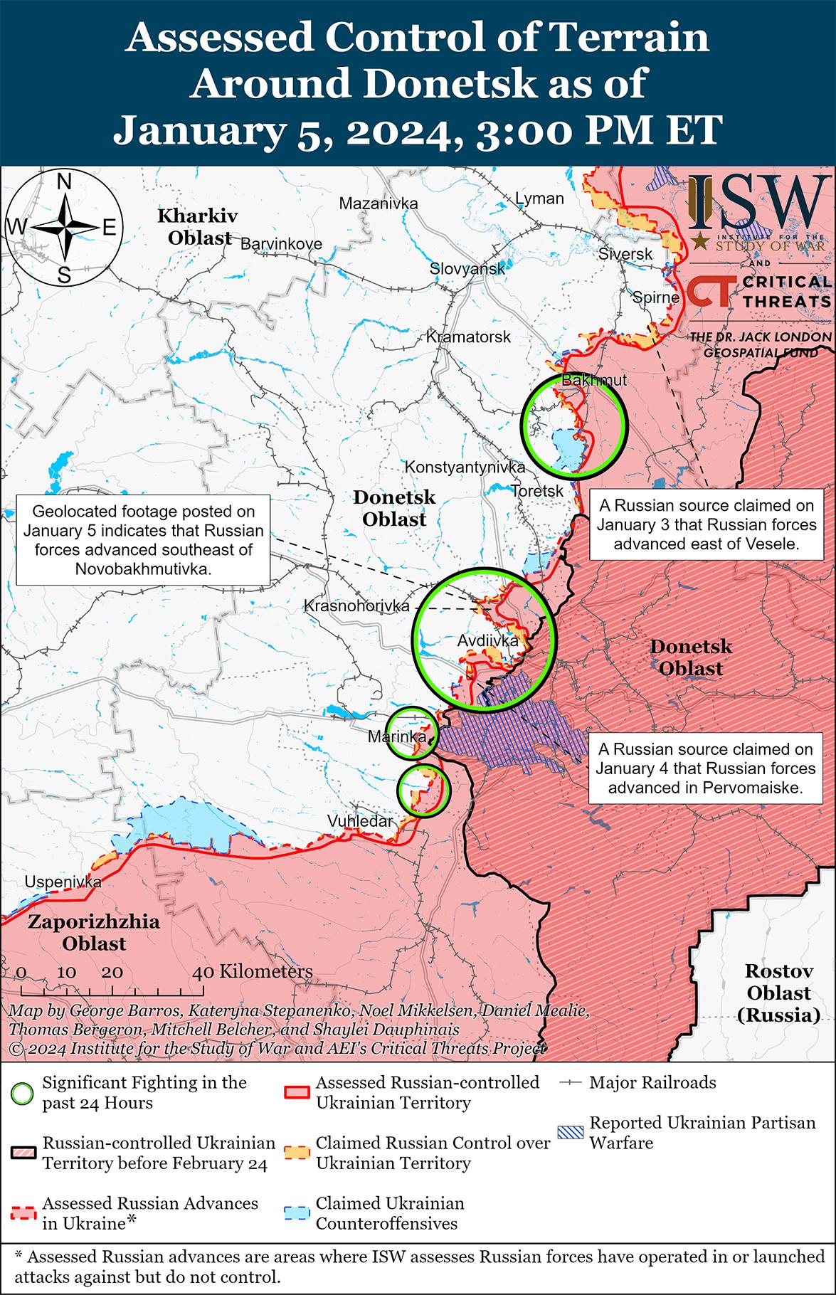 В последнее время российские войска незначительно продвинулись вблизи Авдеевки и активизировали темпы своих наступательных действий в этом районе. На геолоцированных кадрах, опубликованных 4 января, видно, что российские войска продвинулись к северу от Авдеевки в районе Авдеевского коксохимического завода и к северо-западу от Авдеевки вдоль железнодорожной линии возле Новобахмутовки. [46] 5 января российские военные утверждали, что российские войска также продвинулись на 400 метров вдоль железнодорожной ветки к северу от дачного участка «Точмаш» к северо-западу от Авдеевки и на 400 метров возле Авдеевского коксохимического завода. [47] Российский блогер утверждал, что российские войска к северо-западу от Авдеевки в районе Бердичей продвигаются в среднем на 100 метров каждые два дня. [48] Враг атаковал вблизи Авдеевки, Новобахмутовки, Степного, Первомайского и Невельского. [49] Глава Авдеевской городской военной администрации Виталий Барабаш заявил, что 4 января после затишья с 1 по 3 января российские войска начали наступление с 20 различных направлений, вероятно, имея в виду вспомогательные направления, и что российские войска наносят в этом районе массированные авиационные и артиллерийские удары. [50] Барабаш отметил, что российские войска намерены захватить Авдеевку до президентских выборов 17 марта, но вряд ли это сделают.
