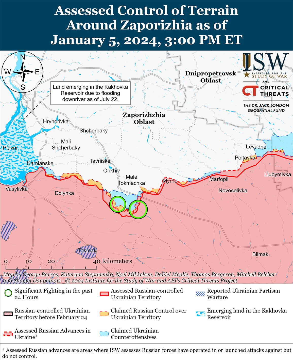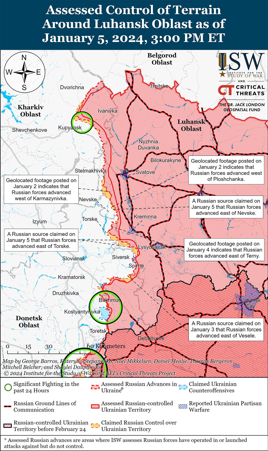 Сообщается, что 5 января российские войска продвинулись на Купянском и Лиманском направлениях, но подтвержденных изменений на линии фронта не было. Российский блогер заявил, что российские войска вытеснили украинские войска с позиций в северной и центральной Синьковке (к северо-востоку от Купянска) и что Синьковка теперь является спорной серой зоной. [41] Другой блогер утверждал, что российские войска продвинулись на позиции в пределах трех километров от Терны и Ямполовки (западнее Кременной), и утверждал, что российские войска пытаются ликвидировать украинский плацдарм на правом берегу реки Жеребец на этом участке. [42] Однако на Купянском и Лиманском направлениях ISW пока не обнаружил визуальных подтверждений этих предполагаемых успехов. Российские и украинские источники сообщали, что продолжались позиционные бои на Купянском направлении в районе Синьковки и восточнее Петропавловки, а также на Лиманском направлении в районе Терны и в Серебрянском лесничестве. [43]