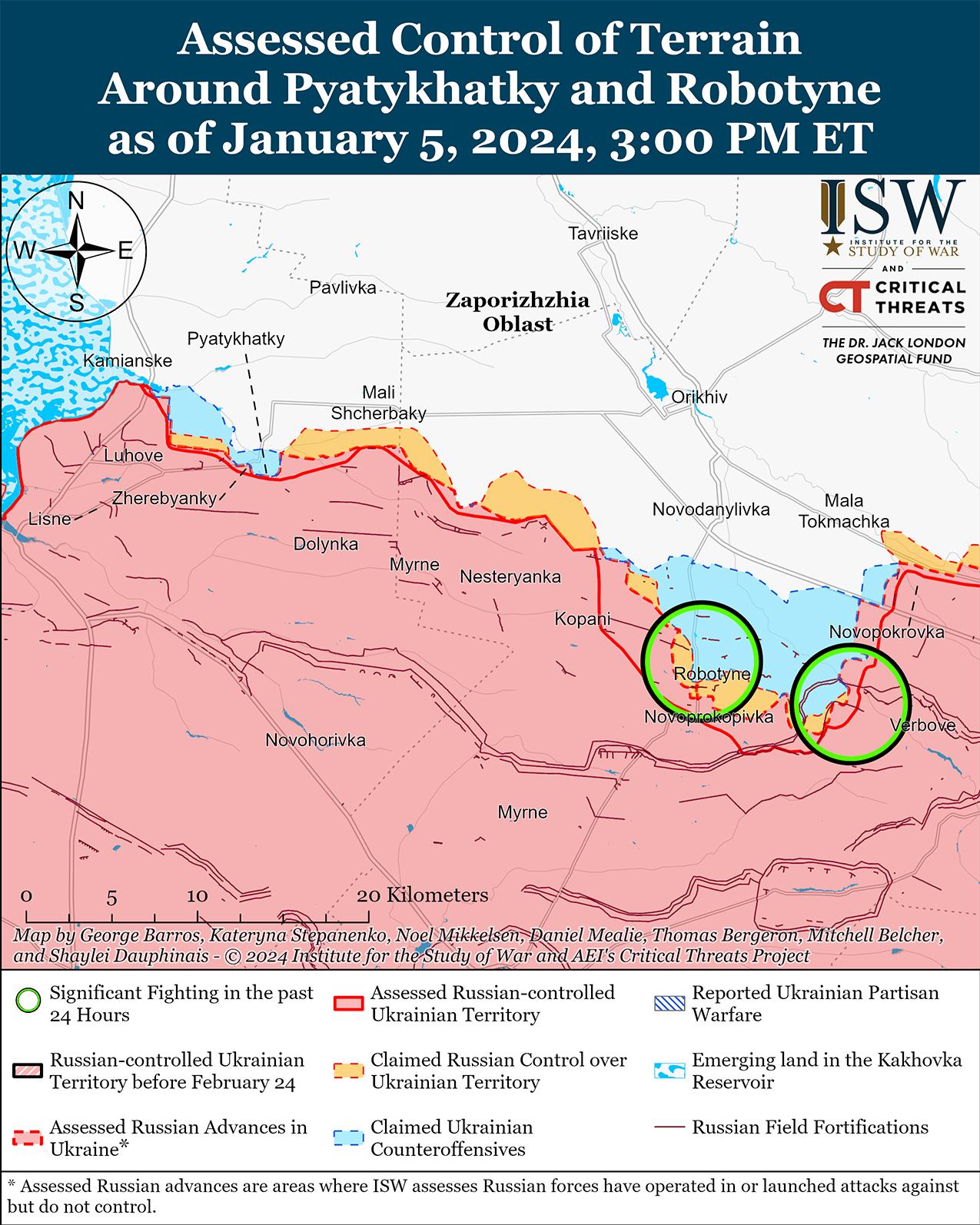 5 января российские и украинские войска продолжили позиционные бои на западе Запорожской области. Российские и украинские источники сообщали, что продолжались позиционные бои вблизи Вербовое (восточнее Роботино), Роботино и Новопрокоповки (юг Роботино). [55]
