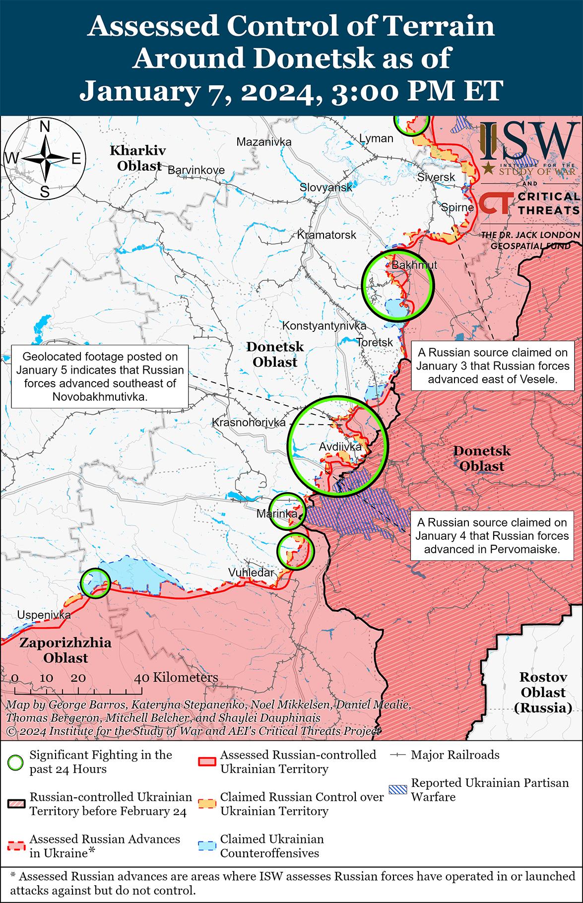 В последнее время российские войска продвинулись к западу и югу от Марьинки (к западу от Донецка). На геолоцированных кадрах, опубликованных 7 января, видно, что российские войска незначительно продвинулись на западе Марьинки и на южных окраинах Новомихайловки (юго-запад Донецка). [38] Российские и украинские источники сообщали, что позиционные бои продолжались вблизи Марьинки, Георгиевки (западнее Марьинки), Новомихайловки и Победы (юго-западнее Донецка). [39] Российский блогер утверждал, что российские и украинские войска сильно заминировали район вокруг Новомихайловки, что затрудняет продвижение как российских, так и украинских войск. [40] Связанный с Кремлем российский блогер утверждал, что российские войска пытаются продвинуться к Георгиевке для достижения оперативной цели по захвату Курахово (западнее Марьинки). [41] Сообщается, что подразделения российского 33-го мотострелкового полка (20-я мотострелковая дивизия, 8-я общевойсковая армия, Южный военный округ) продолжают действовать в районе Новомихайловки. [42]