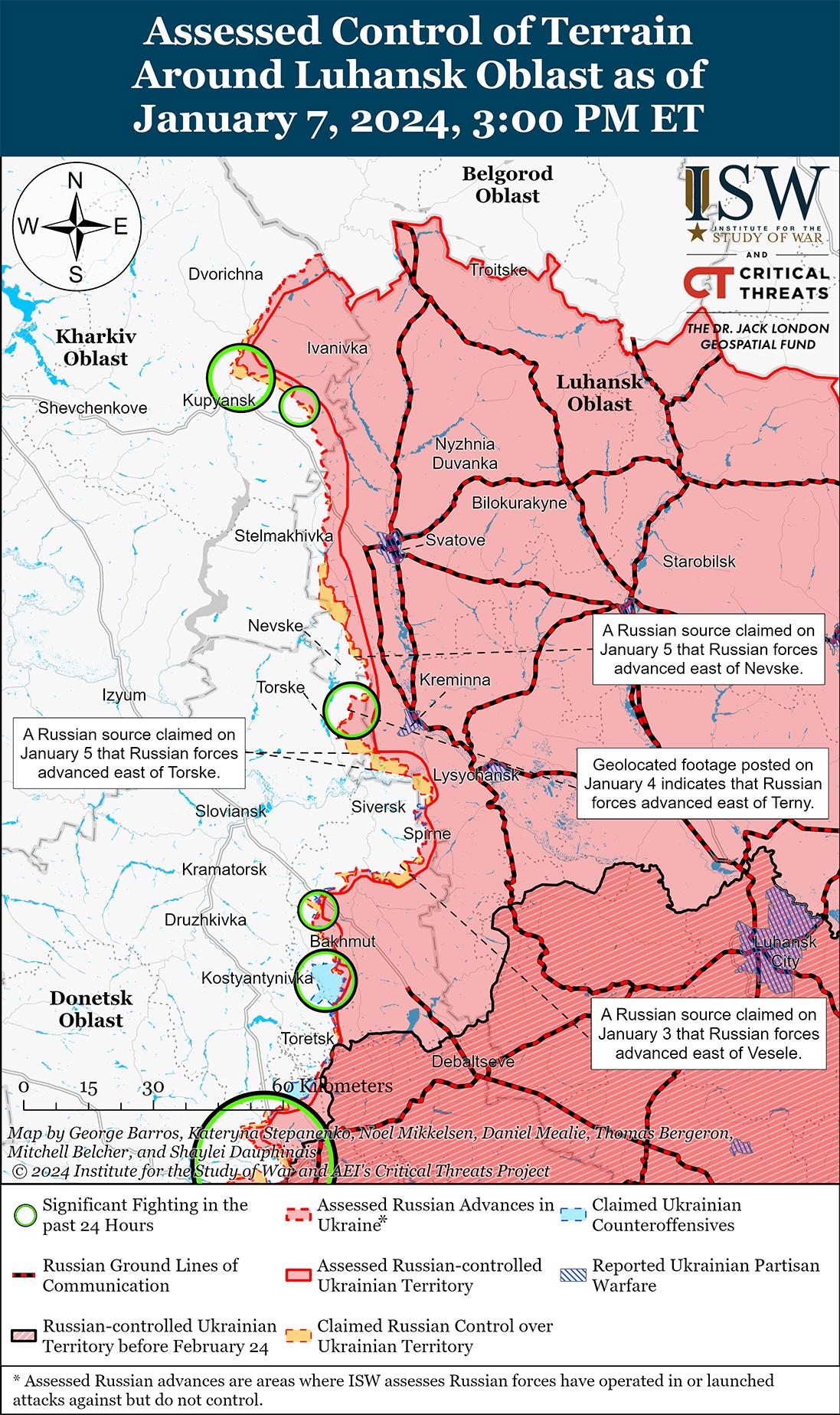 7 января российские и украинские войска продолжили позиционные бои на участке Купянск — Сватово — Кременная, однако подтвержденных изменений линии фронта на этом участке не было. Украинские и российские источники сообщали, что позиционные бои продолжались к северо-востоку и востоку от Купянска в районе Синьковки, озера Лиман, Ивановки и Петропавловки и к западу от Кременной в районе Ямполовки и Терн. [30] Российские военные блогеры утверждали, что российские войска захватили несколько позиций в районе Синьковки и недавно добились значительных успехов к юго-западу и западу от Кременной в районе Серебрянского лесничества, Торского, Терны и Ямполовки, но ISW не обнаружил визуальных подтверждений этих заявлений. [31] Сообщается, что на Купянском направлении действуют соединения 1-й гвардейской танковой армии РФ (Западный военный округ). [32]