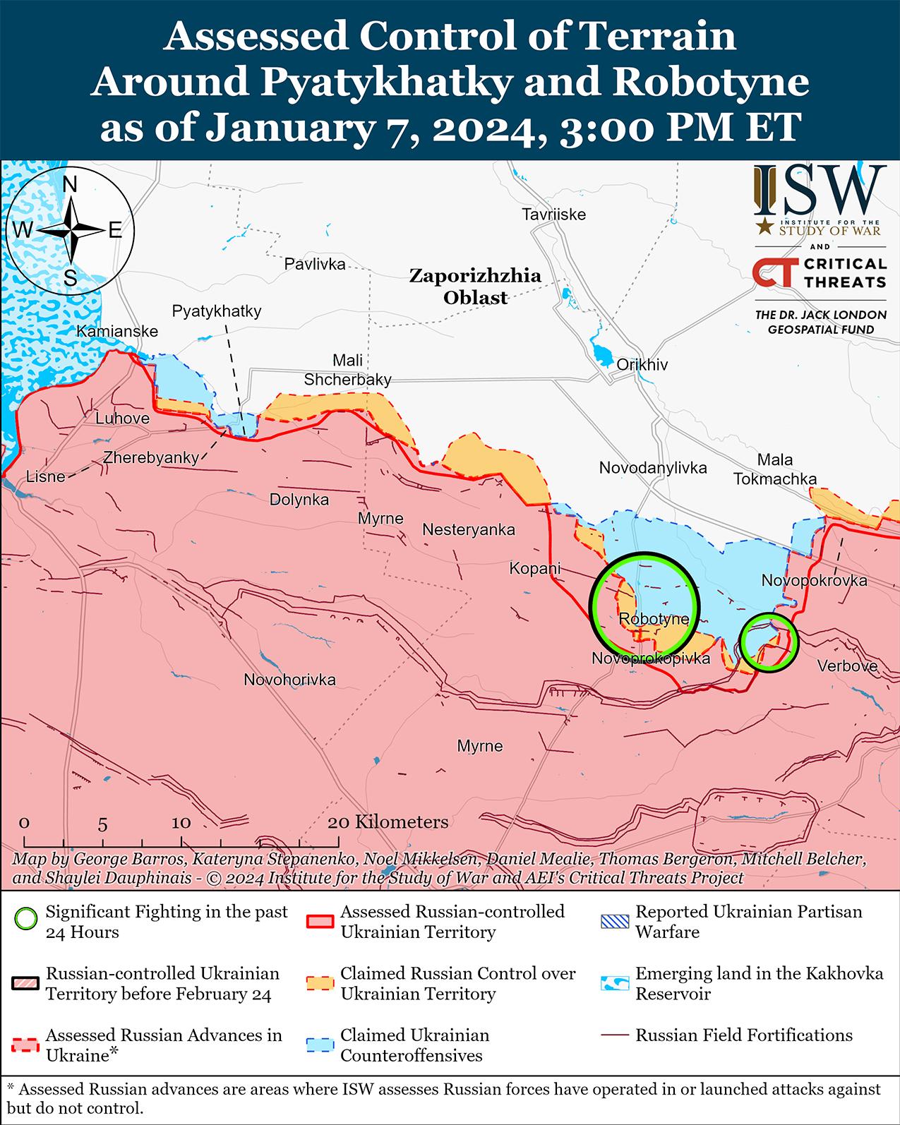 По состоянию на 7 января украинские силы продолжали удерживать позиции на восточном (левом) берегу Херсонской области, линия фронта не изменилась. Продолжались позиционные бои в районе Крынки на восточном берегу Днепра. [50] Российский военный блогер заявил, что успешное сбитие украинскими самолетами российских самолетов в декабре 2023 г. препятствует использованию российской авиацией на Херсонском направлении, и добавил, что российские войска по-прежнему сталкиваются с проблемами с оперативным потоком информации, связи, радиоэлектронной борьбы (РЭБ) и взаимодействия подразделений в Крынки и других районах на восточном берегу. [51] Блогер также отметил, что украинские силы активно минируют российские наземные линии коммуникаций (НЛК) на Херсонском направлении. [52] Украинские военнослужащие, действовавшие в районе Крынок, заявили, что российские войска регулярно атакуют украинские позиции в Крынках небольшими пехотными группами численностью до 10 человек, и сослались на проблемы Украины, действующие на восточном берегу, такие как неспособность вовремя эвакуировать погибших военнослужащих или использование Россией дронов.[53]