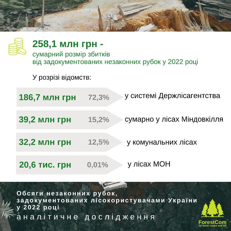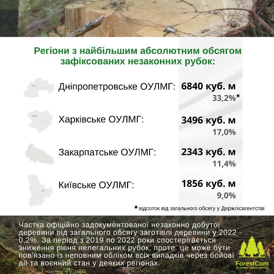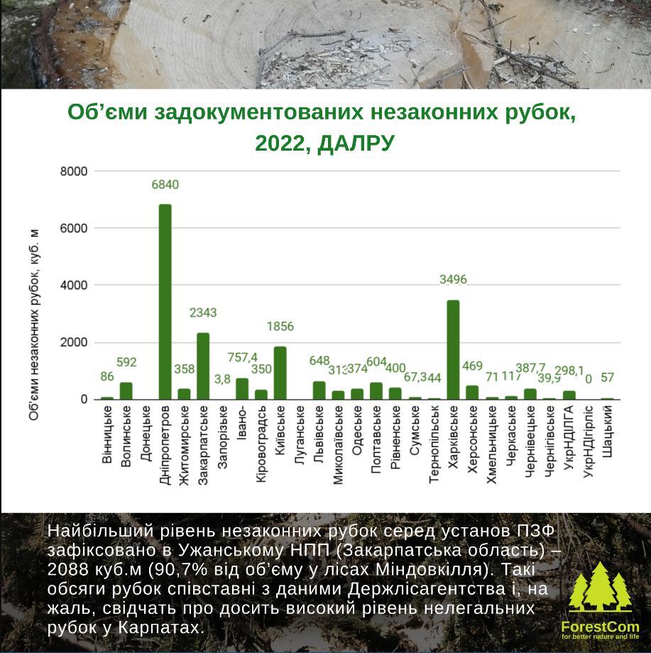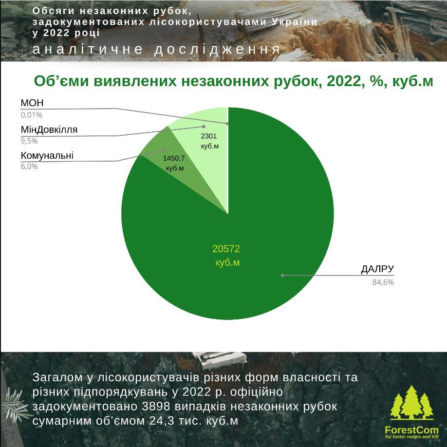 Сумарний об’єм незаконно добутої деревини в Україні у 2022 р. за даними самих лісокористувачів склав щонайменше 24,327 тис. куб.м, або 0,2% від загального рівня офіційної лісозаготівлі.