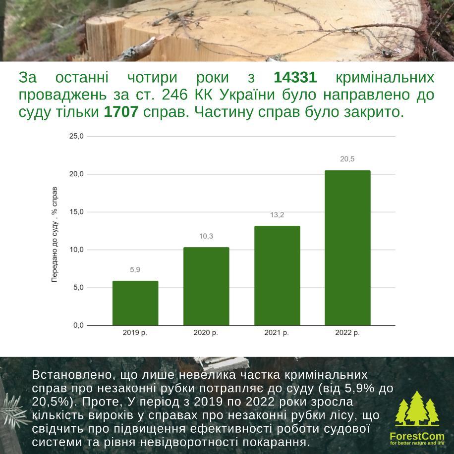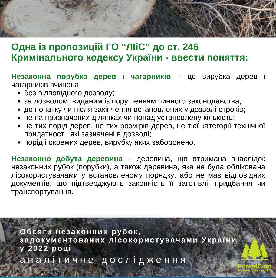 У зв’язку з цим ГО «Лісові ініціативи і суспільство» пропонує внести зміни до ст. 246 Кримінального кодексу України, зокрема, щодо визначення понять «незаконна порубка» і «незаконно добута деревина», а також прийняти на законодавчому рівні проєкт уніфікованої форми звітності для всіх лісокористувачів України для звітування про обсяги виявлених ними незаконних рубок.