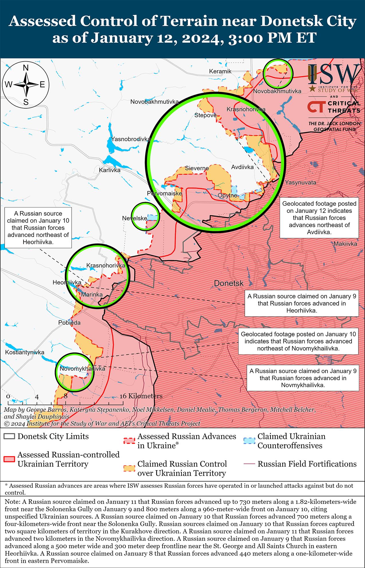 Недавно российские войска добились незначительного успеха к северо-западу от Авдеевки. На геолоцированных кадрах, опубликованных 12 января, видно, что российские войска недавно продвинулись к востоку от Авдеевского коксохимического завода на северо-западе Авдеевки. [49] Российские военные блогеры утверждали, что российские войска продвинулись вблизи водоочистных сооружений в районе коксохимического завода, что в целом согласуется с имеющимися геолокационными кадрами. [50] Военблогер также утверждал, что российские войска продвинулись на восточной окраине Первомайского (юго-западнее Авдеевки) между районом Измайловского пруда и улицей Першотравневой, однако ISW не обнаружил визуальных доказательств этих заявлений. [51] Российские и украинские войска сообщали о продолжении боев к северо-западу от Авдеевки в районах населенных пунктов Новобахмутовка, Очеретино, Степное и Очеретино; рядом с территорией коксохимического завода; в юго-восточной части Авдеевки в промзоне; и юго-западнее Авдеевки в районе Невельского и Первомайского. [52] Командующий украинской Таврийской группировкой войск бригадный генерал Александр Тарнавский заявил, что в рядах российских войск, воюющих на Таврийском направлении (Авдеевка, приграничный район Донецкой и Запорожской областей и западная часть Запорожской области), из-за плохой подготовки наблюдаются высокие потери. [53]
