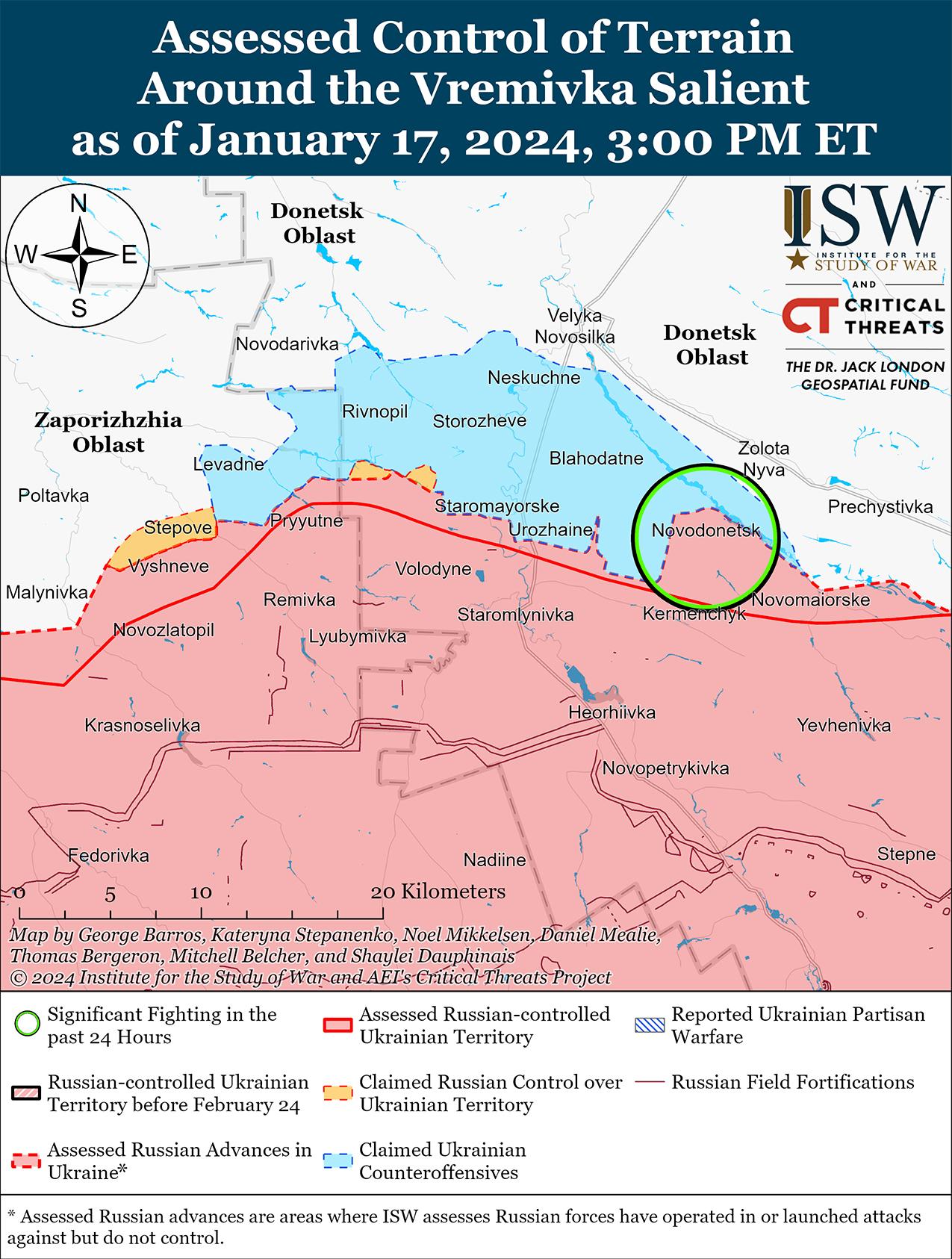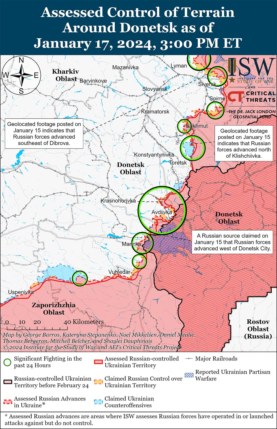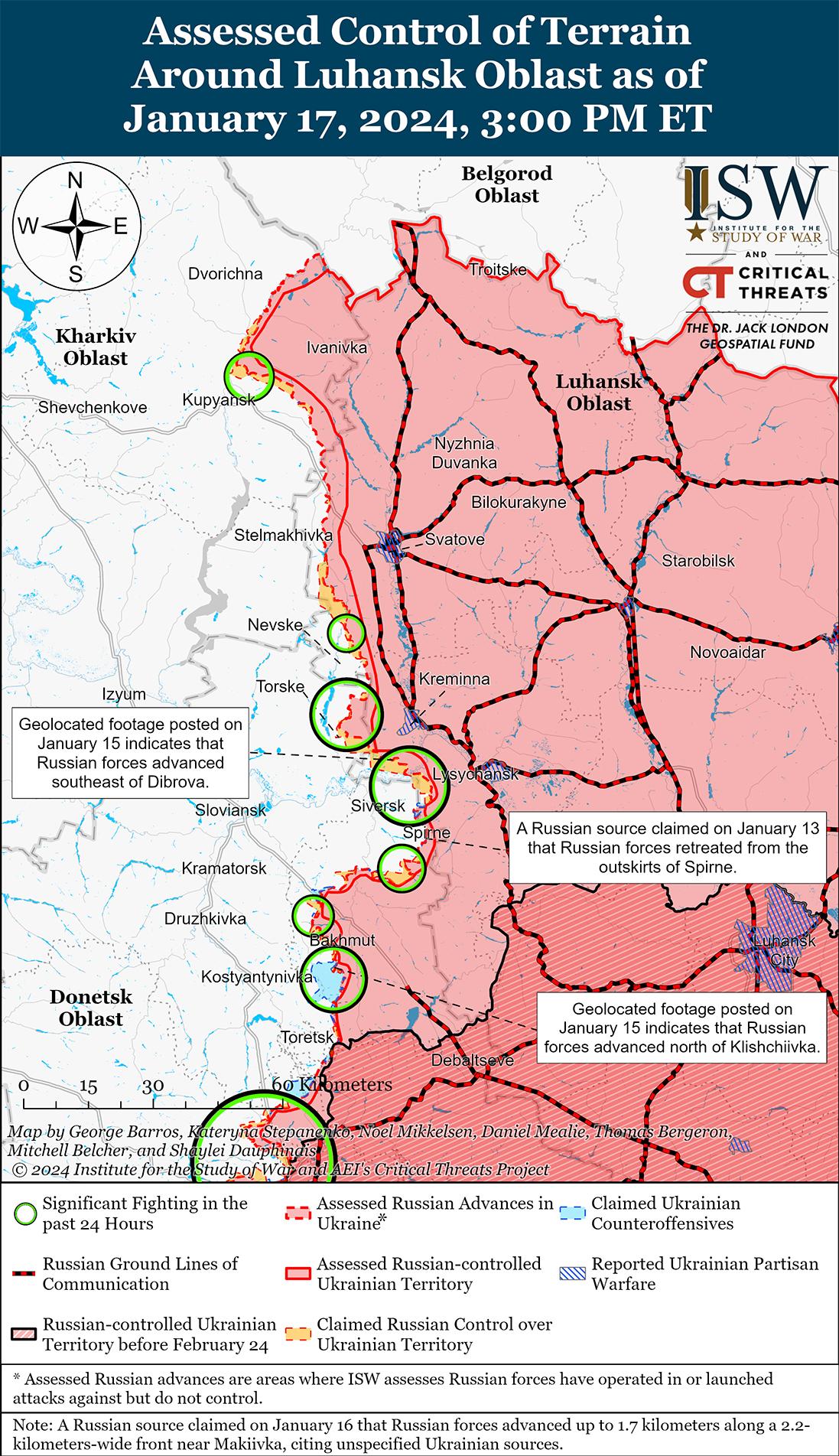 17 января продолжались позиционные бои под Бахмутом, но подтвержденных изменений на фронте на этом участке не было. Украинские и российские источники сообщали, что позиционные бои продолжались к северо-востоку от Бахмута в районах населенных пунктов Веселое, Белогоровка (21 км к северо-востоку от Бахмута) и Спорное; к северу от Бахмута в районе Раздоловки; северо-западнее Бахмута в районе Григорьевки и Богдановки; западнее Бахмута в районе Хромова и Ивановского; и к юго-западу от Бахмута в районе Клещеевки и Андреевки. [75] Российский военный блогер утверждал, что темпы продвижения российских войск на Бахмутском направлении замедлились после того, как российские войска добились «значительного» продвижения за предыдущие 1,5 месяца. [76] С начала локализованных наступательных операций в этом районе в начале ноября 2023 г. ISW не зафиксировал существенных успехов российских войск в оперативном или тактическом отношении на Бахмутском направлении. [77] Сообщается, что подразделения российской 98-й воздушно-десантной дивизии (ВДВ) продолжают действовать северо-западнее Бахмута, а подразделения 200-й мотострелковой бригады (Северный флот), по сообщениям, продолжают действовать на бахмутском направлении. [78] Сообщается, что в районе Богдановки продолжают действовать подразделения российской добровольческой бригады «Север-В», а на Соледарском направлении в составе «Русского добровольческого корпуса» действуют подразделения российского отряда «Невский». [79]