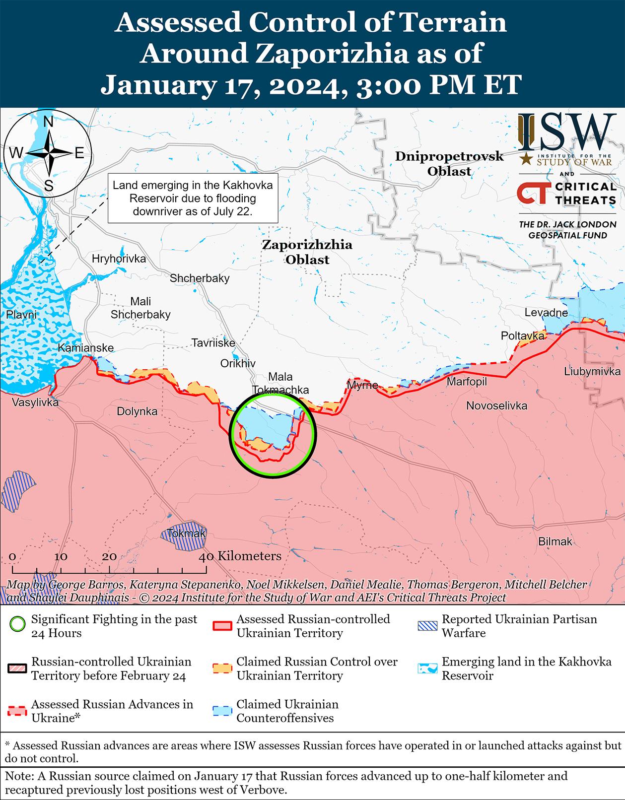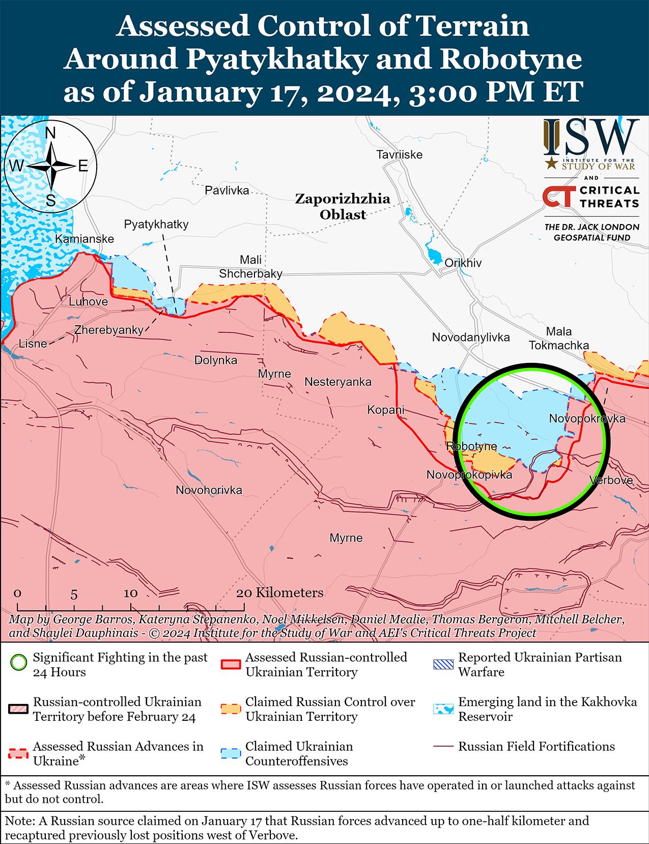 17 января на западе Запорожской области продолжались позиционные бои, однако подтвержденных изменений линии фронта на этом участке не было. Известный российский блогер, связанный с Кремлем, заявил, что российские войска продвинулись на 500 метров и отбили ранее утраченные позиции к западу от Вербовое (к востоку от Роботино), хотя ISW не обнаружил визуальных доказательств, подтверждающих это утверждение. [91] Продолжались позиционные бои в районах населенных пунктов Пятихатки (27 км к северо-западу от Роботино), Копани (северо-западнее Роботино), Роботино, Вербовое, Новопрокоповка (к югу от Роботино). [92] Сообщается, что подразделения российского 429-го мотострелкового полка (19-я мотострелковая дивизия, 58-я ОА, ЮВО) и 136-й мотострелковой бригады (58-я ОА, ЮВО) продолжают действовать на Запорожском направлении и вдоль линии Роботино – Копани соответственно. [93]