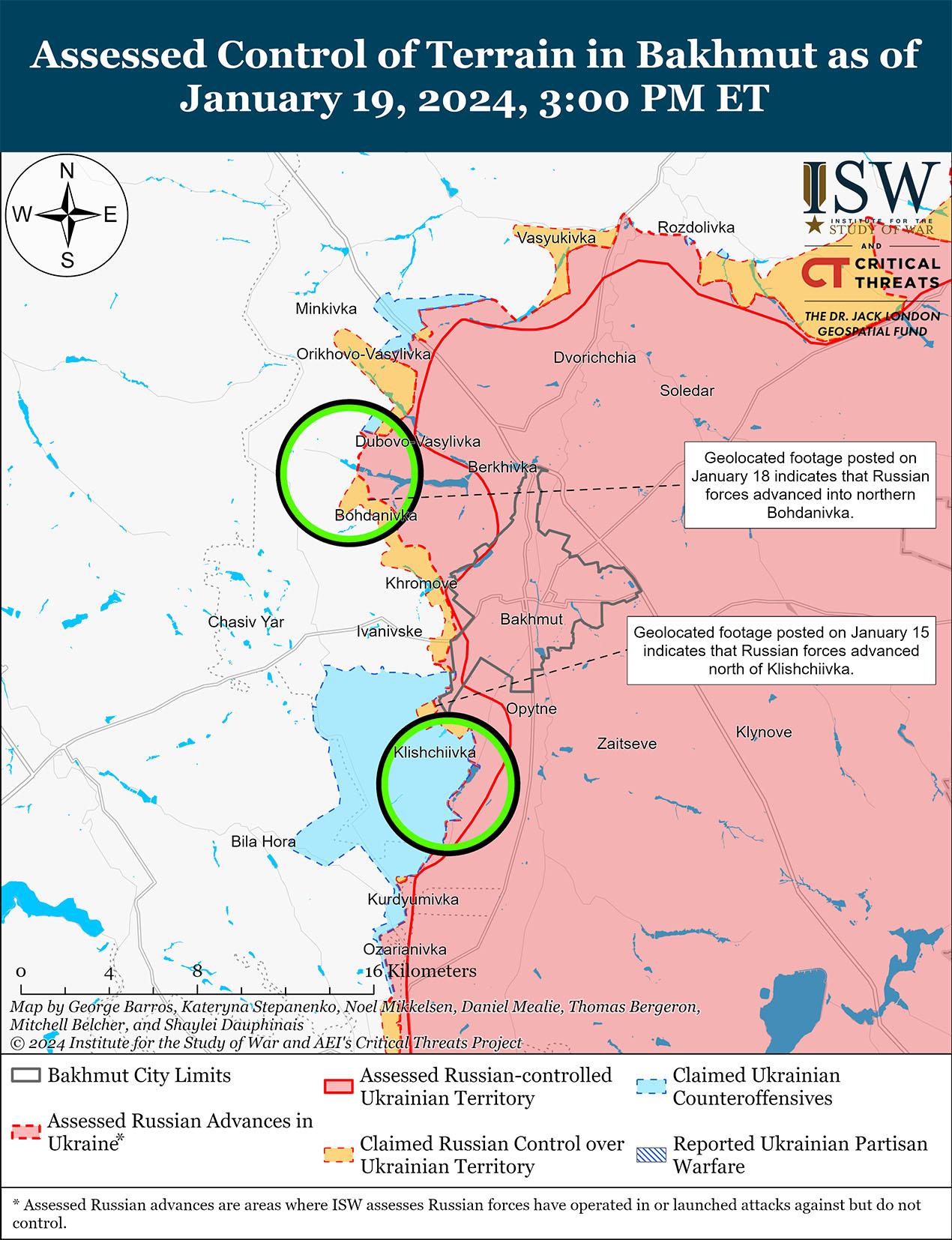 Позиционные бои под Бахмутом продолжались 19 января, но подтвержденных изменений линии фронта на этом участке не было. Российские и украинские источники сообщали, что позиционные бои продолжались к северо-западу от Бахмута в районе Богдановки; к западу от Бахмута в районе Хромова и к юго-западу от Бахмута в районе Клещеевки и Андреевки. [75] Российские военные блогеры утверждали, что российские войска совершили тактическое наступление в районе Богдановки, однако ISW не обнаружил подтверждения этому заявлению. [76]