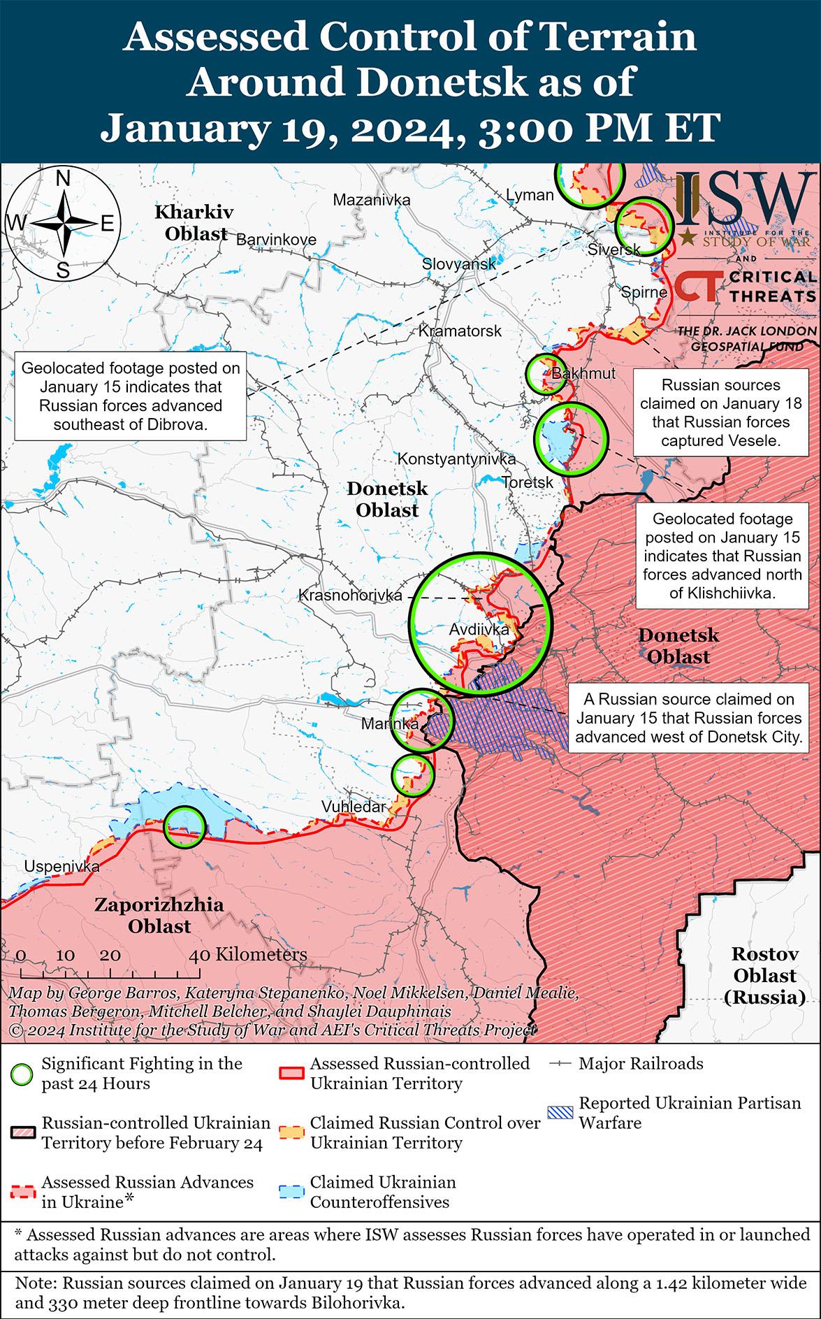 Сообщается, что 19 января российские войска продвинулись на окраинах Авдеевки на фоне продолжающихся позиционных боев в этом районе. Российские военные блогеры утверждали, что российские войска совершили тактические успехи на окраинах Авдеевки; севернее Авдеевки в районе Степного; и юго-западнее Авдеевки в районе Первомайского и Невельского. [77] Украинский журналист Юрий Бутусов утверждал, что небольшие группы российской пехоты вошли в Авдеевку, а украинский военный, действовавший в этом районе, сообщил, что российские войска незначительно продвинулись в жилом секторе Авдеевки в восточной части города. [78] Однако ISW не обнаружил каких-либо подтверждений сообщений о продвижении российских войск вблизи или в Авдеевке. Украинские и российские источники сообщали, что позиционные бои также продолжались к северо-западу от Авдеевки вблизи Новокалинового и Новобахмутовки; западнее Авдеевки в районе Тоненького; вблизи коксохимического завода на северо-западе Авдеевки, карьера «Голубые озера» непосредственно к северу от Авдеевки и промзоны к юго-востоку от Авдеевки; и восточнее Авдеевки в районе Каменки. [79] Глава Авдеевской городской военной администрации Виталий Барабаш заявил, что погодные условия на Авдеевском направлении в последнее время позволяли российским войскам вести механизированные штурмовые действия по городу на мерзлом грунте, но 18 января земля оттаяла и помешала российским механизированным атакам. [80] Барабаш также заявил, что российские войска больше не имеют значительного численного преимущества в беспилотниках с видом от первого лица (FPV) на этом участке фронта. [81]