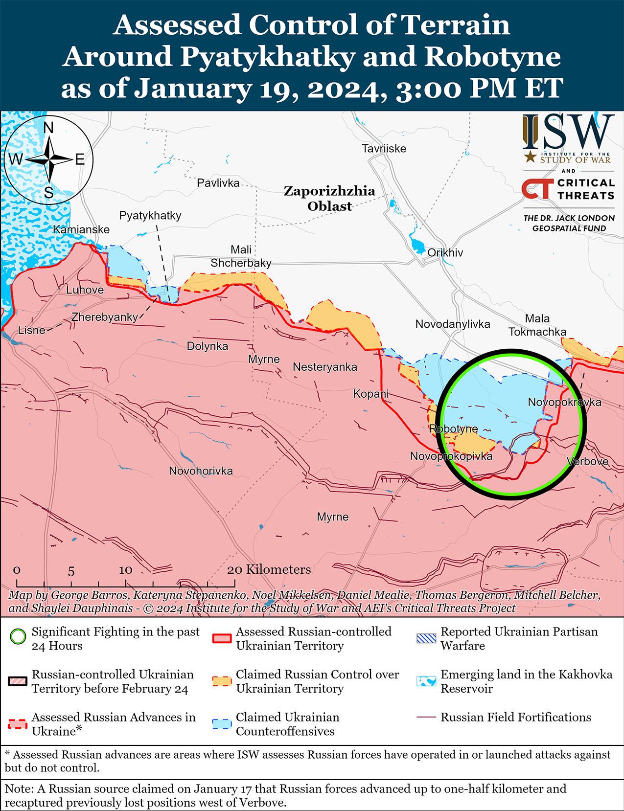 На западе Запорожской области продолжались позиционные бои, однако по состоянию на 19 января подтвержденных изменений линии фронта на этом участке не было. Российские и украинские источники сообщали, что позиционные бои продолжались к западу от Вербовое (к востоку от Роботино) и в районе Роботино и Новопрокоповки (к югу от Роботино). [86]