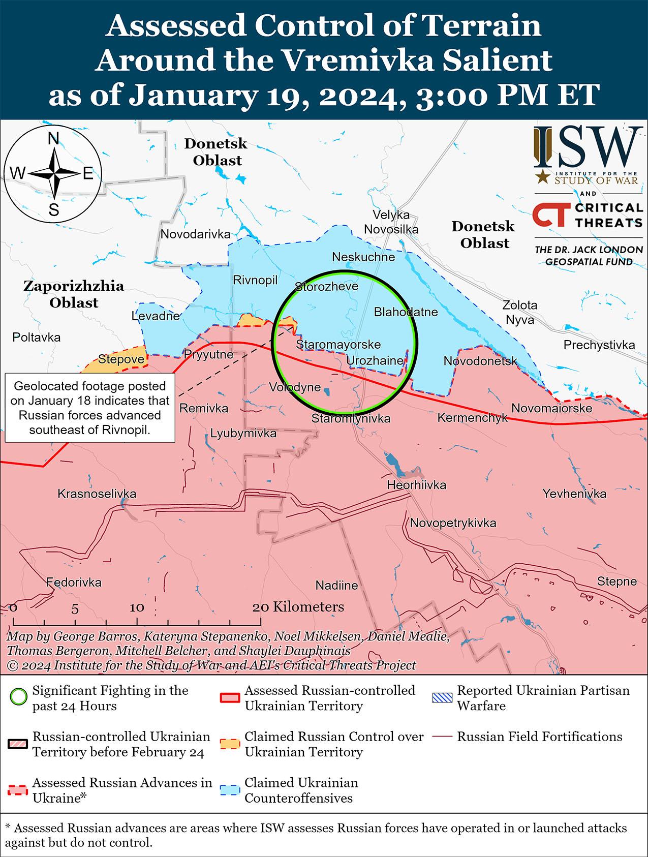 Недавно российские войска продвинулись на линии Купянск-Сватово к юго-востоку от Купянска. На кадрах, опубликованных 18 января, видно, что российские войска продвинулись в лесном массиве к востоку от Табаевки (примерно в 25 км к юго-востоку от Купянска). [60] 19 января известный российский блогер, связанный с Кремлем, заявил, что российские войска начали «массированное наступление» в этом районе и продвинулись до полукилометра к западу от железной дороги в направлении Крахмального и Табаевки. [61] ISW пока не обнаружил визуальных подтверждений продвижения российских войск через железнодорожную линию в этом районе или каких-либо признаков того, что российские войска начали здесь «массированное» наступление. Спикер Сухопутных войск Украины подполковник Владимир Фитё отметил, что российские войска в последние дни активизировали атаки вдоль линии Купянск-Лиман и продвигаются вперед. [62] Фитё также заявил, что за прошедшие сутки украинские силы уничтожили 13 танков и 14 БМП на Купянском и Лиманском направлениях, что указывает на то, что российские войска, вероятно, перебросили в этот район значительное количество бронетехники. [63] Российские военные блогеры утверждали, что российские войска продолжают оказывать давление на украинские силы в районе Синьковки (северо-восточнее Купянска). [64] Российские и украинские источники сообщали о позиционных боях к северо-востоку от Купянска в районе Синьковки и Петропавловки и к юго-востоку от Купянска в районе Табаевки. [65]