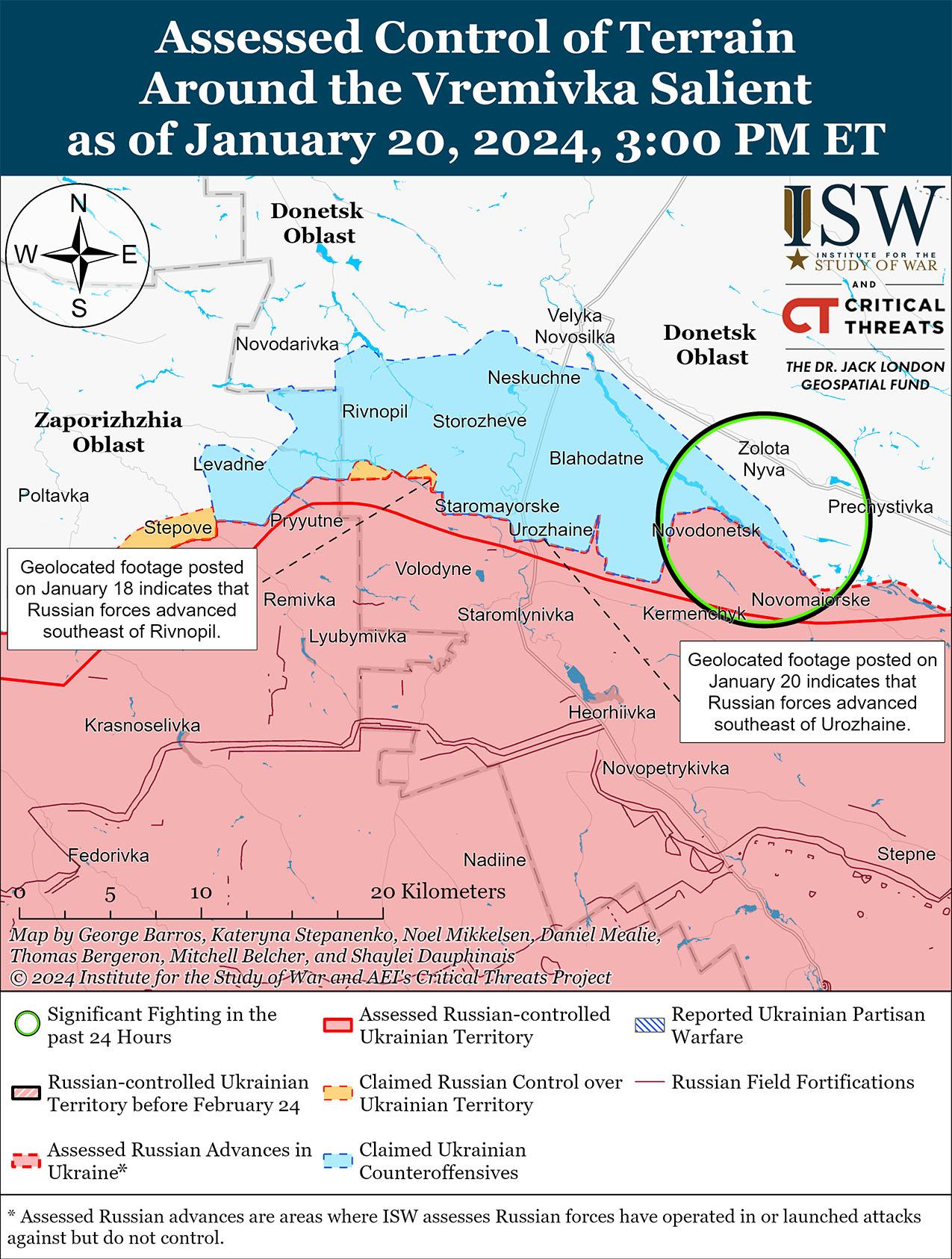 Российские войска продвинулись в приграничном районе участка границы Донецкой и Запорожской областей. Геолоцированные кадры, опубликованные 20 января, показывают ограниченные российские успехи к юго-востоку от Урожайного (10 км к югу от Великой Новоселки). [42] Российские и украинские источники утверждали, что позиционные бои велись южнее Золотой Нивы (юго-восточнее Великой Новоселки) и южнее Великой Новоселки в районе Урожайного и Старомайорского. [43]