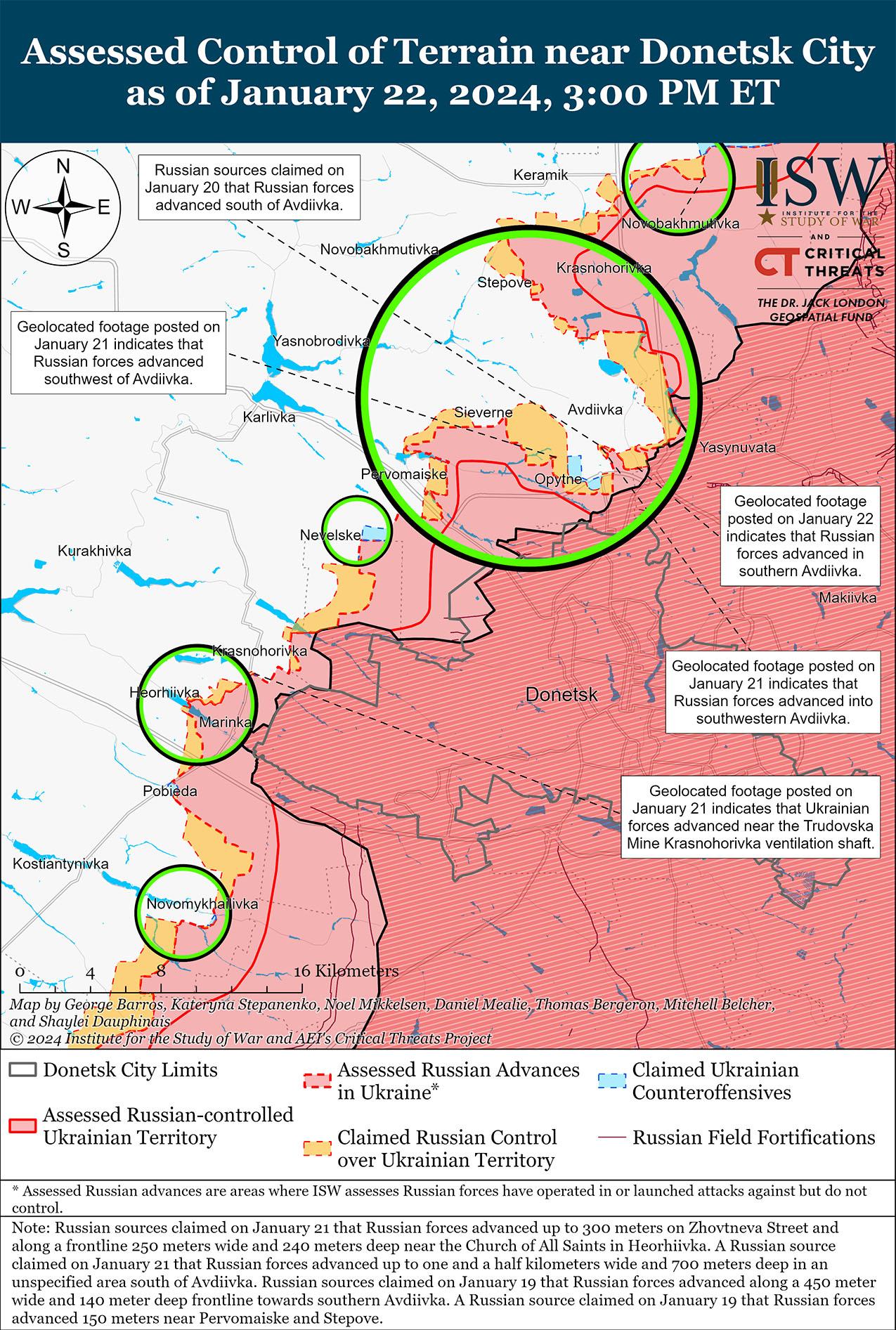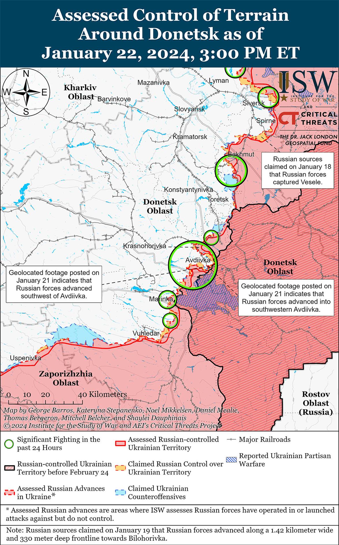 Российские войска недавно добились подтвержденных успехов к югу от Авдеевки и, как сообщается, продолжили наступление на юге Авдеевки 22 января. Геолоцированные кадры, опубликованные 22 января, показывают, что российские войска недавно продвинулись за пределы участка железной дороги к югу от Авдеевки. [48] 21 и 22 января российские военные утверждали, что российские войска закрепили позиции в районе ресторана «Царская охота» к югу от Авдеевки и продолжили наступление по улицам Спортивная, Соборная и Черенышевского на южной окраине Авдеевки. [49] 22 января российский блогер заявил, что украинские силы по-прежнему контролируют территорию между рестораном «Царская охота» и Авдеевским карьером и садом «Виноградники» на юго-востоке Авдеевки. [50] Российские и украинские источники сообщали о позиционных боях к северо-западу от Авдеевки в районах населенных пунктов Очеретино, Новокалиново, Новобахмутовка и Степное; вблизи самой Авдеевки; западнее Авдеевки в районе Северного; и юго-западнее Авдеевки в районе Первомайского и Невельского. [51] По имеющимся сведениям, в районе Авдеевки действуют подразделения интернациональной добровольческой бригады «Пятнашка» Донецкой Народной Республики (ДНР), а в предполагаемом захвате района ресторана «Царская охота» участвовали подразделения 1487-го мотострелкового полка ДНР. [52]