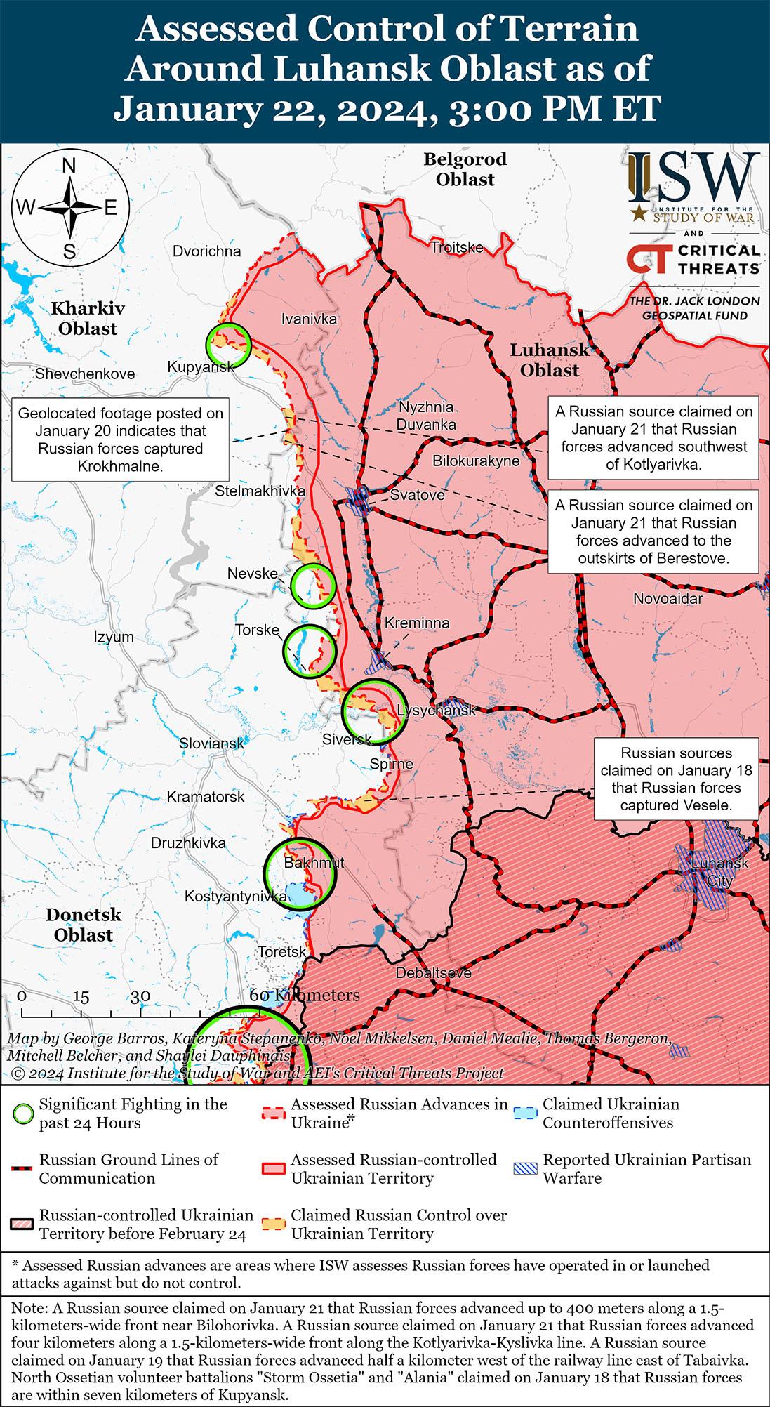 22 января российские войска продолжили интенсивные наступательные действия к юго-востоку от Купянска и, по сообщениям, продвинулись вперед. Несколько российских блогеров утверждали, что российские войска продолжают наступление к юго-западу от Крахмального в районе Берестово (25 км к юго-востоку от Купянска). [35] Известный российский блогер, связанный с Кремлем, заявил 21 января, что российские войска продвинулись на четыре километра вглубь фронта шириной 1,5 км к линии Котляровка-Кисловка (20 км к юго-востоку от Купянска и к северу от района Крахмального), хотя ISW пока не обнаружил визуальных подтверждений российских успехов в направлении Котляровки. [36] Военблогеры утверждали, что продвижение российских войск на этом участке позволит российским войскам выйти на дорогу Р07 Купянск-Сватово и открыть новый фронт против Купянска. [37] Российские и украинские источники сообщали, что позиционные бои продолжались к северо-востоку от Купянска в районе Синьковки и Петропавловки. [38] Сообщается, что на Купянском направлении продолжают действовать подразделения 1-й гвардейской танковой армии РФ (Западный военный округ). [39]