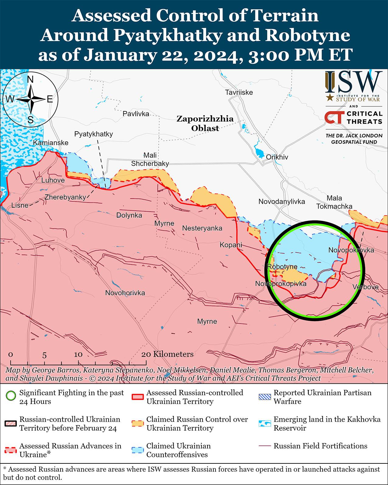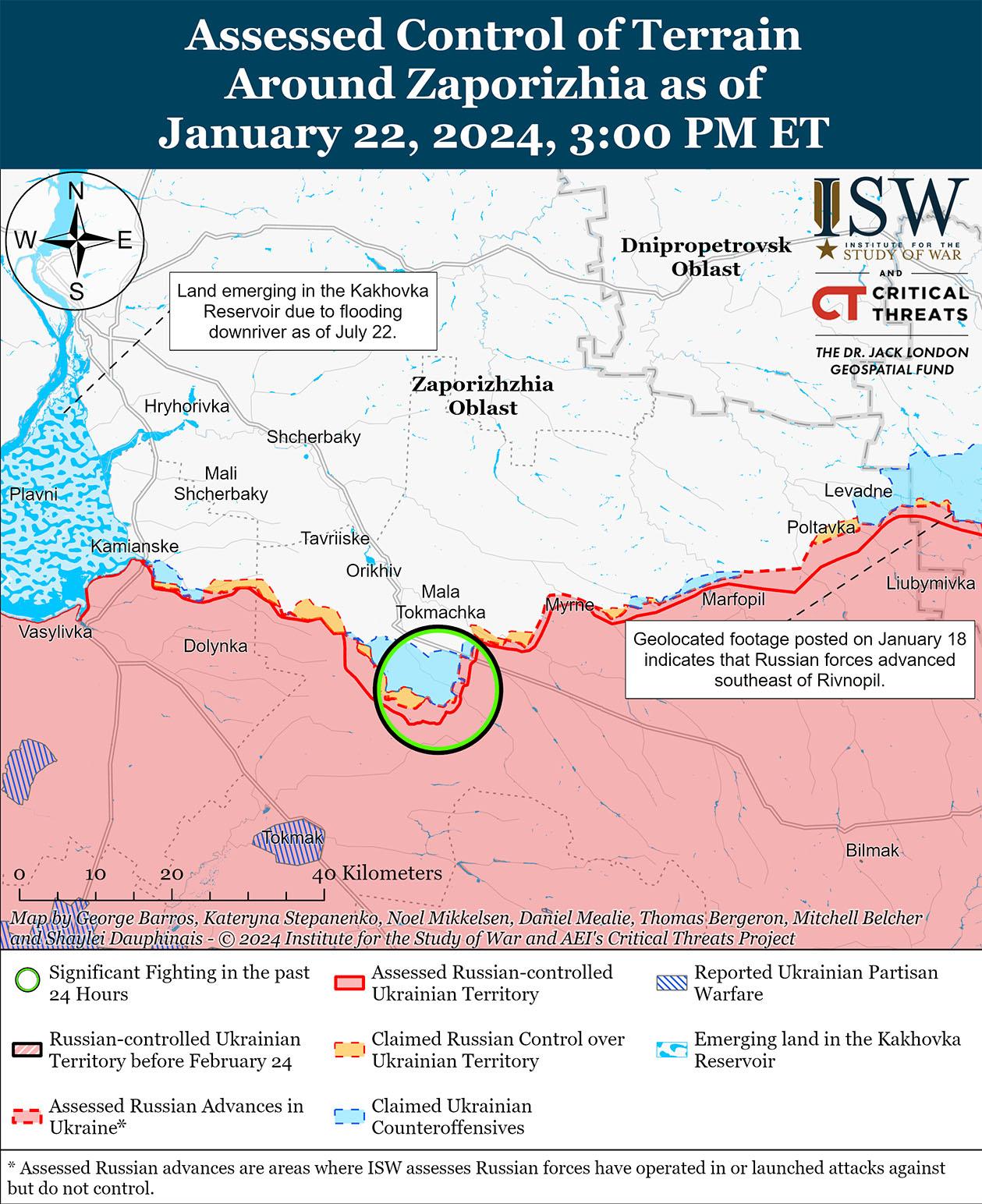 22 января на западе Запорожской области продолжались позиционные бои, однако подтвержденных изменений на этом участке фронта не было. Российские военные блогеры утверждали, что украинские силы захватили несколько неназванных позиций возле Вербовое (к востоку от Роботино), хотя ISW не обнаружил визуальных доказательств, подтверждающих это утверждение. [60] Российские и украинские источники сообщали, что позиционные бои продолжались вблизи Роботино, Вербовое, Новопрокоповка (к югу от Роботино), Пятихатки (27 км к северо-западу от Роботино) и Каменское (35 км к северо-западу от Роботино). [61] Российские военные блогеры утверждали, что частые удары украинских беспилотников с видом от первого лица (FPV) усложняют российские операции на Запорожском направлении. [62]