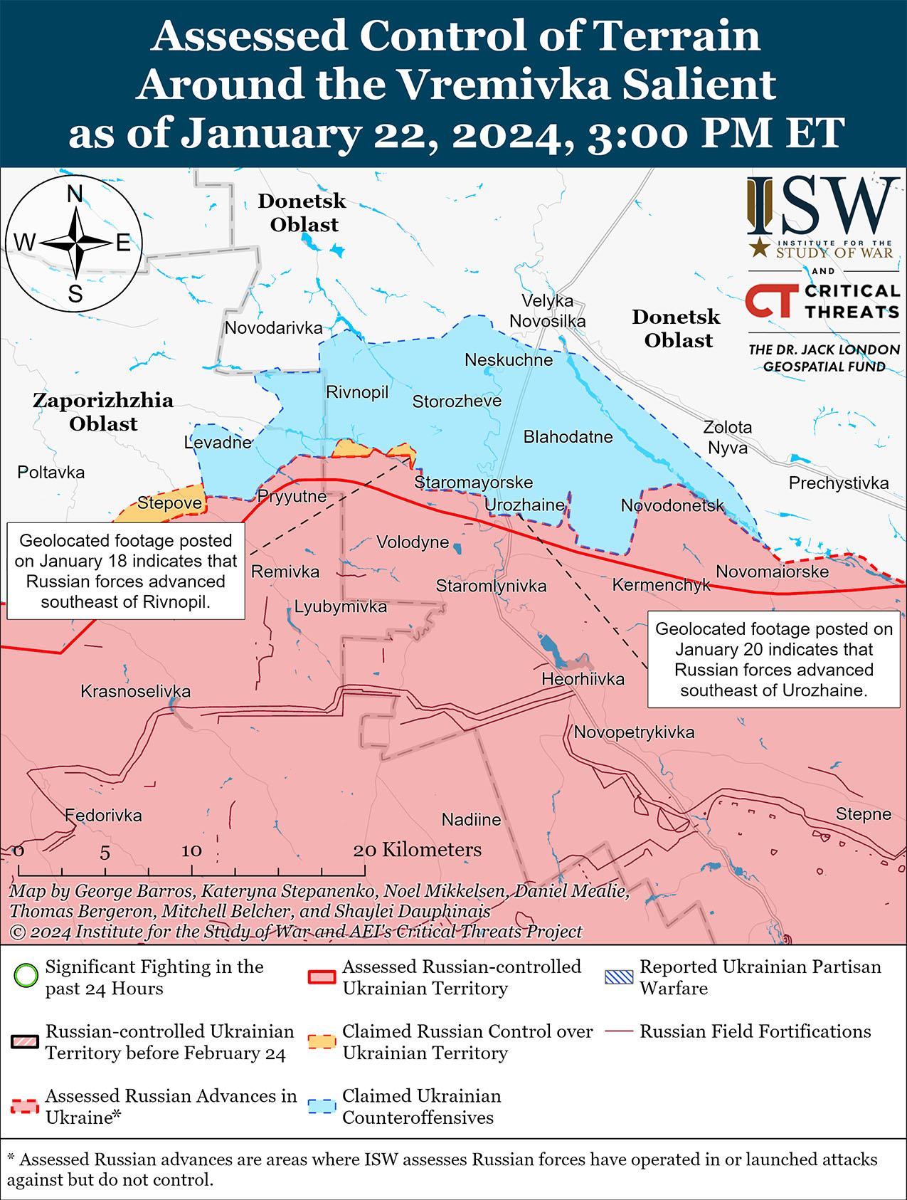 22 января на участке границы Донецкой и Запорожской областей продолжались позиционные бои, однако подтвержденных изменений на этом участке фронта не было. Российские и украинские источники утверждали, что украинские силы незначительно продвинулись к югу от Урожайное (к югу от Великой Новоселки), хотя ISW не обнаружил визуальных доказательств, подтверждающих это предполагаемое продвижение. [58] Российские источники утверждали, что позиционные бои продолжались вблизи Новодонецкого (юго-восточнее Великой Новоселки), Старомайорского и Завитного Бажанни (оба южнее Великой Новоселки). [59]