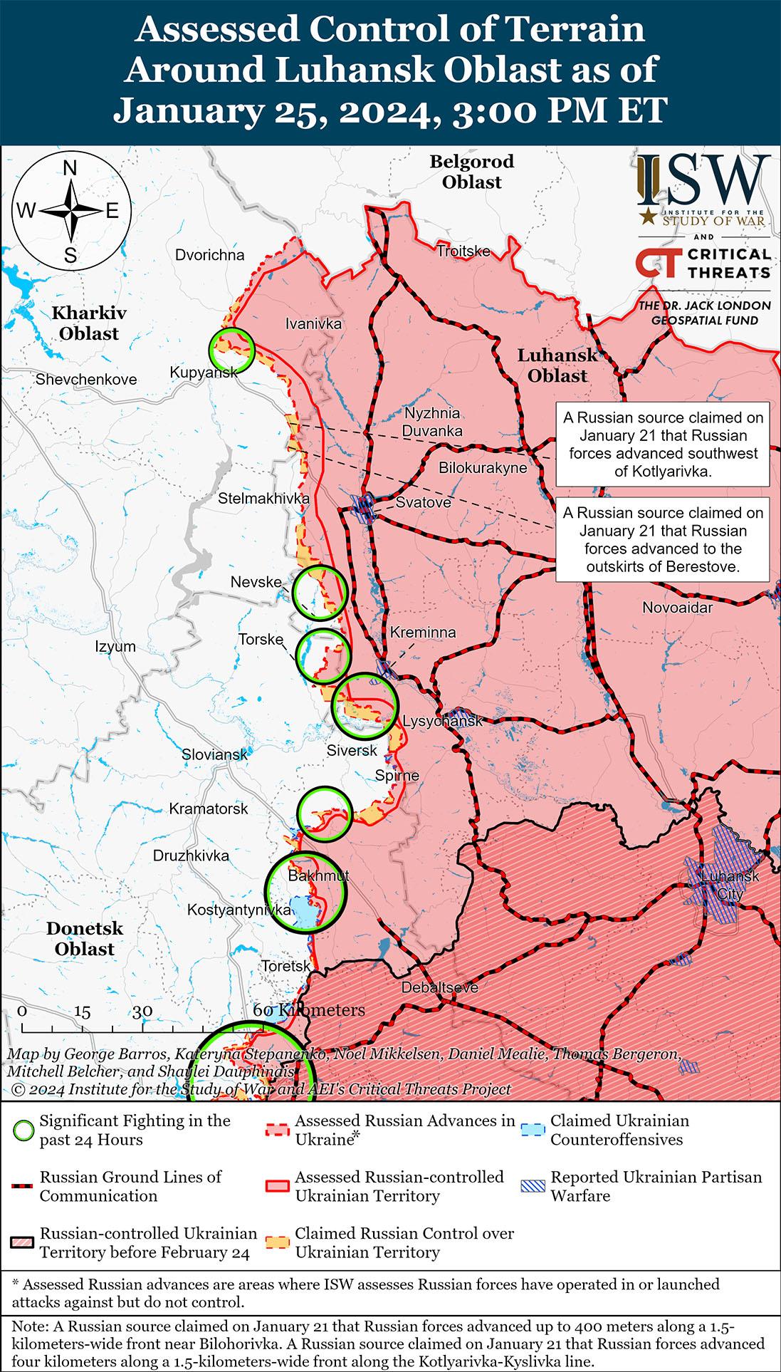 Сообщается, что российские войска продвинулись вдоль линии Сватово-Кременная, но 25 января подтвержденных изменений на фронте на этом участке не было. Продолжались позиционные бои северо-западнее Сватово в районе Стельмаховки; северо-западнее и западнее Кременной вблизи Ямполовки, Макеевки, Торского и Терного; юго-западнее Кременной в районе Диброва и Серебрянского лесничества; и южнее Кременной возле Белогоровки. [47] Известный российский военный блогер утверждал, что российские войска в районе Сватово пытаются установить контроль над Берестово (северо-западнее Сватово) и близлежащими высотами. [48] Российские военные блогеры утверждали, что российские войска продвинулись в направлении Терного, а также к востоку и югу от Белогоровки, однако ISW не обнаружил визуальных подтверждений этих заявлений. [49] Российский источник утверждал, что украинские минные поля осложняют наступательные действия РФ в районе Белогоровки. [50] Украинский военный обозреватель Константин Машовец заявил, что подразделения 20-й общевойсковой армии РФ (ЗВО) и 25-й общевойсковой армии (по имеющимся данным, либо ЦВО, либо Восточного военного округа) не продвинулись к Тернам и не отрезали дорогу Р07 Торское — Ямполовка — Терны — Невское после возобновления наступательных действий в этом районе 1,5 недели назад. [51] Машовец заявил, что подразделения 252-го мотострелкового и 237-го танковых полков (3-й мотострелковой дивизии 20-й общевойсковой армии) оставили несколько неназванных позиций в районе Макеевки. [52]