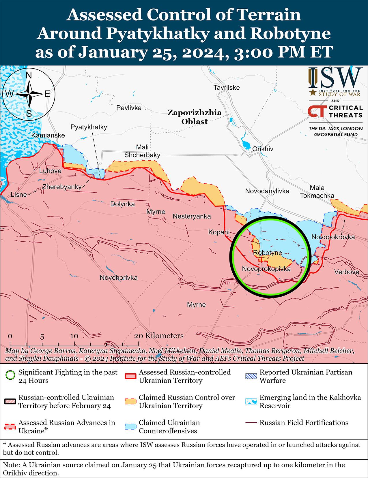 Сообщается, что украинские силы недавно продвинулись к северо-западу от Работино, но по состоянию на 25 января ISW не наблюдал недавних изменений на линии фронта. Машовец сообщил, что украинские силы продвинулись до одного километра в глубину к юго-западу от Мирного (16 км к северо-западу от Работино) в зоне обороны российской 69-й бригады прикрытия (35-я ОА). [78] Машовец сообщал, что украинским силовикам удалось отразить атаку подразделений российского 70-го гвардейского мотострелкового полка (42-я мотострелковая дивизия, 58-я ОА, Южный военный округ) в направлении Новопрокоповки (южнее Работино) после того, как эти подразделения попытались атаковать украинские позиции в районе Работино. [79] Машовец добавил, что украинские силы продолжают удерживать позиции на расстоянии от 1,5 до 2 километров (предположительно на переднем крае) на главной линии обороны России к северо-западу от Вербового (к востоку от Работино), несмотря на постоянное давление со стороны российской 76-й воздушно-десантной дивизии (ВДВ). Позиционные бои происходили юго-восточнее и западнее Работино и в районе Вербовое. [80]