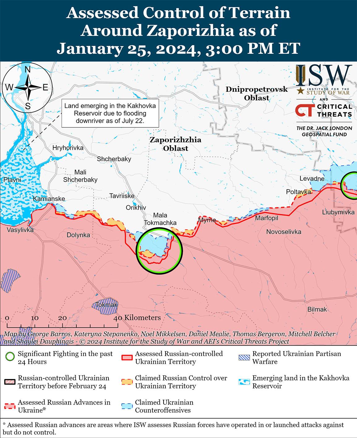 Украинский источник сообщил 25 января, что украинские силы незначительно продвинулись в восточной части Запорожской области, но ISW не обнаружил визуальных доказательств, подтверждающих это сообщение. Украинский военный обозреватель Константин Машовец сообщил, что украинские войска оттеснили российские войска на 150 метров к северо-востоку от Завитное Бажання (12 км к югу от Великой Новоселки). [75] Машовец уточнил, что вблизи Завитного Бажання действуют подразделения 60-й отдельной мотострелковой бригады (5-я общевойсковая армия, Восточный военный округ) и 37-й гвардейской мотострелковой бригады (36-я ОА, ВВО). Продолжались позиционные бои восточнее и западнее Старомайорского (южнее Великой Новоселки) и южнее Золотой Нивы (юго-восточнее Великой Новоселки). [76] Сообщается, что подразделения 40-й бригады морской пехоты (ТОФ) продолжают действовать на южном Донецком направлении (участок от Новомихайловки до границы Донецкой и Запорожской областей). [77]