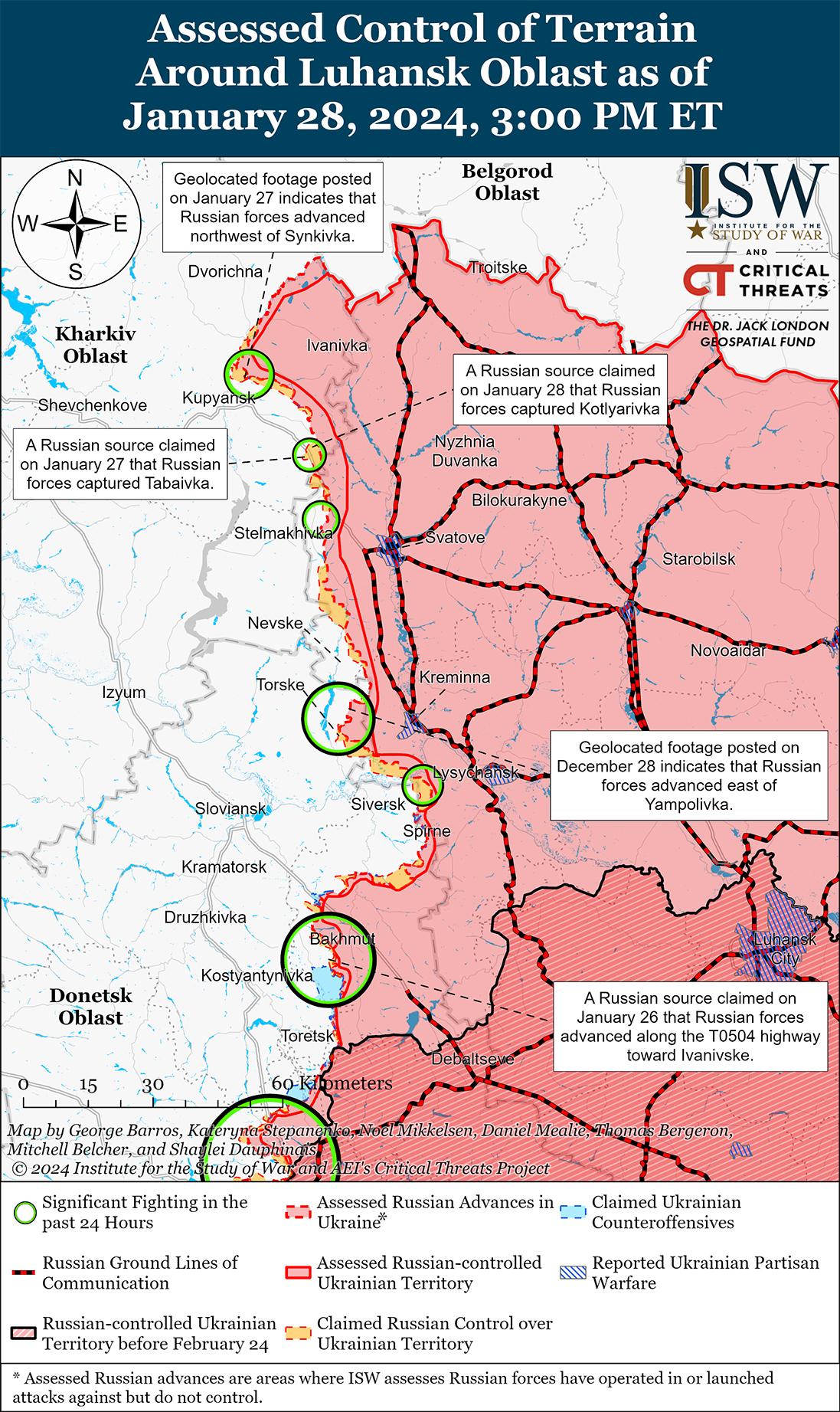 Российские источники утверждали, что российские войска продвинулись к юго-востоку от Купянска (северо-западнее Сватово) 28 января, но украинские военные источники пока не подтвердили эти заявления. Российские военные блогеры продолжали утверждать, что подразделения российской 47-й танковой дивизии (1-я гвардейская танковая армия, Западный военный округ) захватили Табаевку (юго-восточнее Купянска) и господствующие высоты в этом районе после захвата Крахмального (юго-восточнее Табаевки). [44] Российские источники также распространили украинскую интерактивную карту, на которой Табаевка была показана под контролем России. [45] Российские военные блогеры утверждали, что российские войска продвинулись в Берестово (28 км к юго-востоку от Купянска) и, возможно, захватили Котляровку (к северо-востоку от Табаевки). [46] По оценке связанного с Кремлем военблогера, российские войска, вероятно, пытаются продвинуться в направлении Кисловки (непосредственно к северу от Котляровки), поскольку населенный пункт расположен вдоль железной дороги на господствующей высоте. [47] Российские военные блогеры утверждали, что российские войска развивают наступление в направлении Песчаного (20 км юго-восточнее Купянска) от Табаевки с целью выхода к реке Оскол, а украинский Генштаб сообщал, что украинские силы отбили атаки россиян к востоку от Песчаного и в районе Табаевки и Стельмаховки (северо-западнее Сватово и южнее Берестово). [48] Российское наступление на Песчаное и локальные атаки к юго-востоку от Купянска (к северо-западу от Сватово), скорее всего, поддерживают усилия России по выходу и нарушению украинских наземных линий коммуникаций (НЛК) через реку Оскол к югу от Купянска, а не поддержку наступления на сам Купянск.