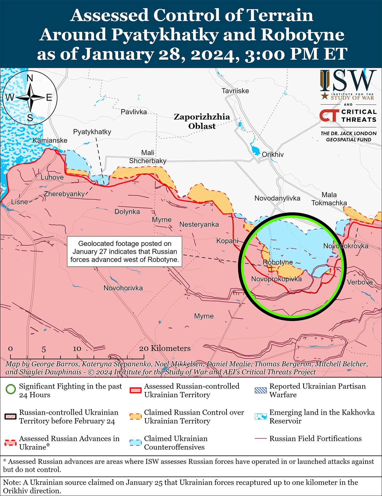 Сообщается, что 28 января украинские силы продвинулись в западной части Запорожской области на фоне продолжающихся позиционных боев в этом районе. Российский военный блогер заявил, что украинские силы отвоевали несколько позиций к западу от Роботино, хотя ISW не обнаружил визуального подтверждения этого заявления. [67] Позиционные бои продолжались западнее Роботино, в районе Новопрокоповки (к югу от Роботино), западнее Вербовое и в районе Новофедоровки (оба восточнее Роботино). [68] Сообщается, что на Запорожском направлении продолжают действовать подразделения 291-го гвардейского мотострелкового полка (42-я мотострелковая дивизия, 58-я ОА, Южный военный округ). [69]