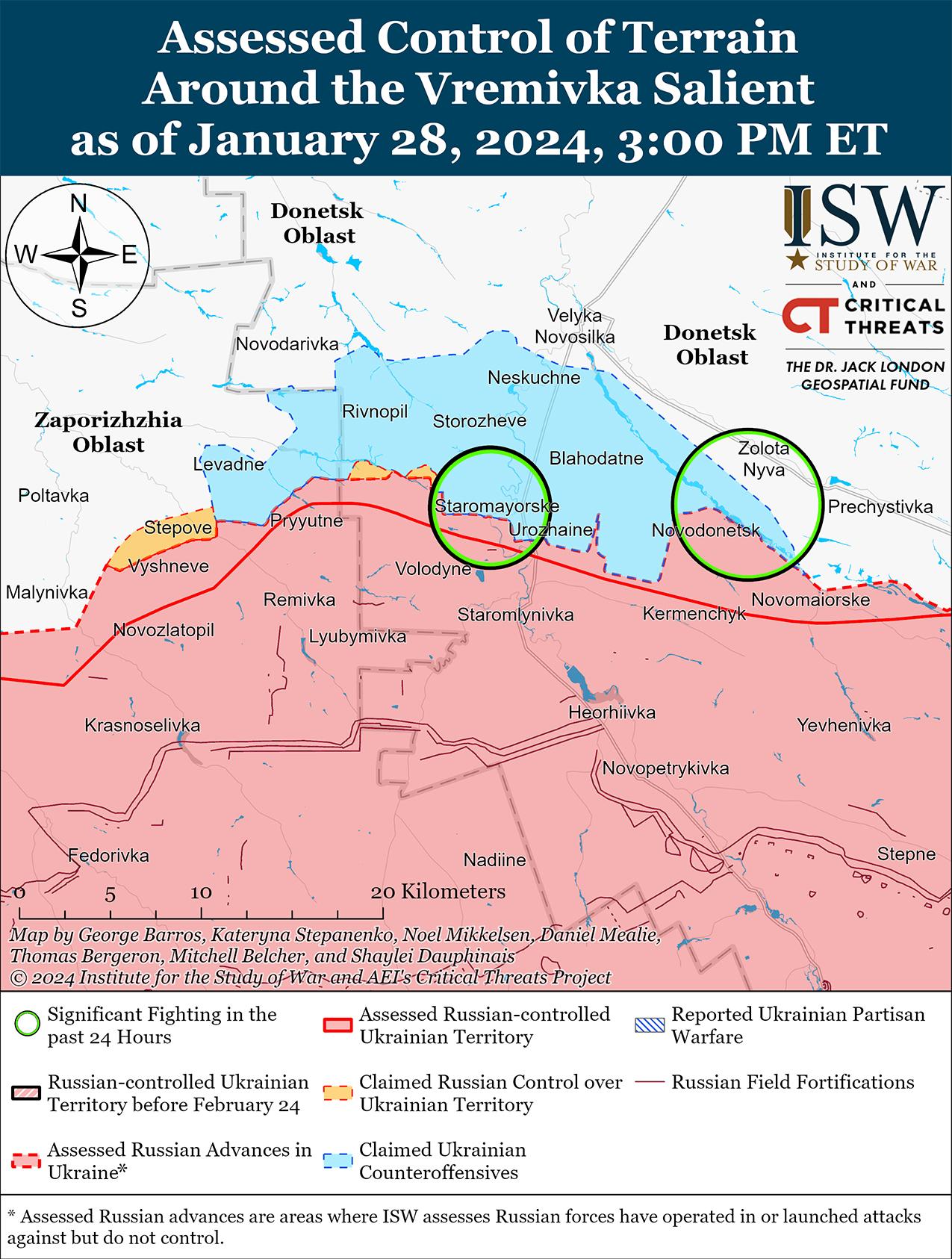 Недавно российские войска подтвердили продвижение в районе Авдеевки на фоне продолжающихся позиционных боев в этом районе 28 января. Геолоцированные кадры, опубликованные 28 января, свидетельствуют о том, что российские войска продвинулись к северу от Степного (северо-запад от Авдеевки) и к юго-востоку от Первомайского (юго-запад от Авдеевки). [55] Продолжались позиционные бои северо-западнее Авдеевки в районе Очеретино, Новобахмутовки и Степного; вблизи самой Авдеевки; западнее Авдеевки в районе Тоненького; и юго-западнее Авдеевки в районе Северного, Первомайского и Невельского. [56] Российские военблогеры утверждали, что российские войска расширили зону контроля возле ресторана «Царская охота» на южной окраине Авдеевки, а один из них утверждал, что есть неподтвержденные сообщения о том, что российские войска полностью контролируют ресторан. [57] Украинский военнослужащий, служивший на Авдеевском направлении, заявил, что украинские военные вытеснили российских войск из ресторана «Царская охота» и что российские войска постоянно меняют тактику на Авдеевском направлении. [58] Российский блогер утверждал, что российские войска с трудом продвигаются вперед, поскольку «клин», в котором действуют российские штурмовые группы и отряды, слишком узкий, вероятно, имея в виду южные окраины Авдеевки. [59] По имеющимся сведениям, подразделения российской 1-й «Славянской» бригады (1-й армейский корпус Донецкой Народной Республики) действуют в районе населенного пункта Спартак (к югу от Авдеевки). [60]