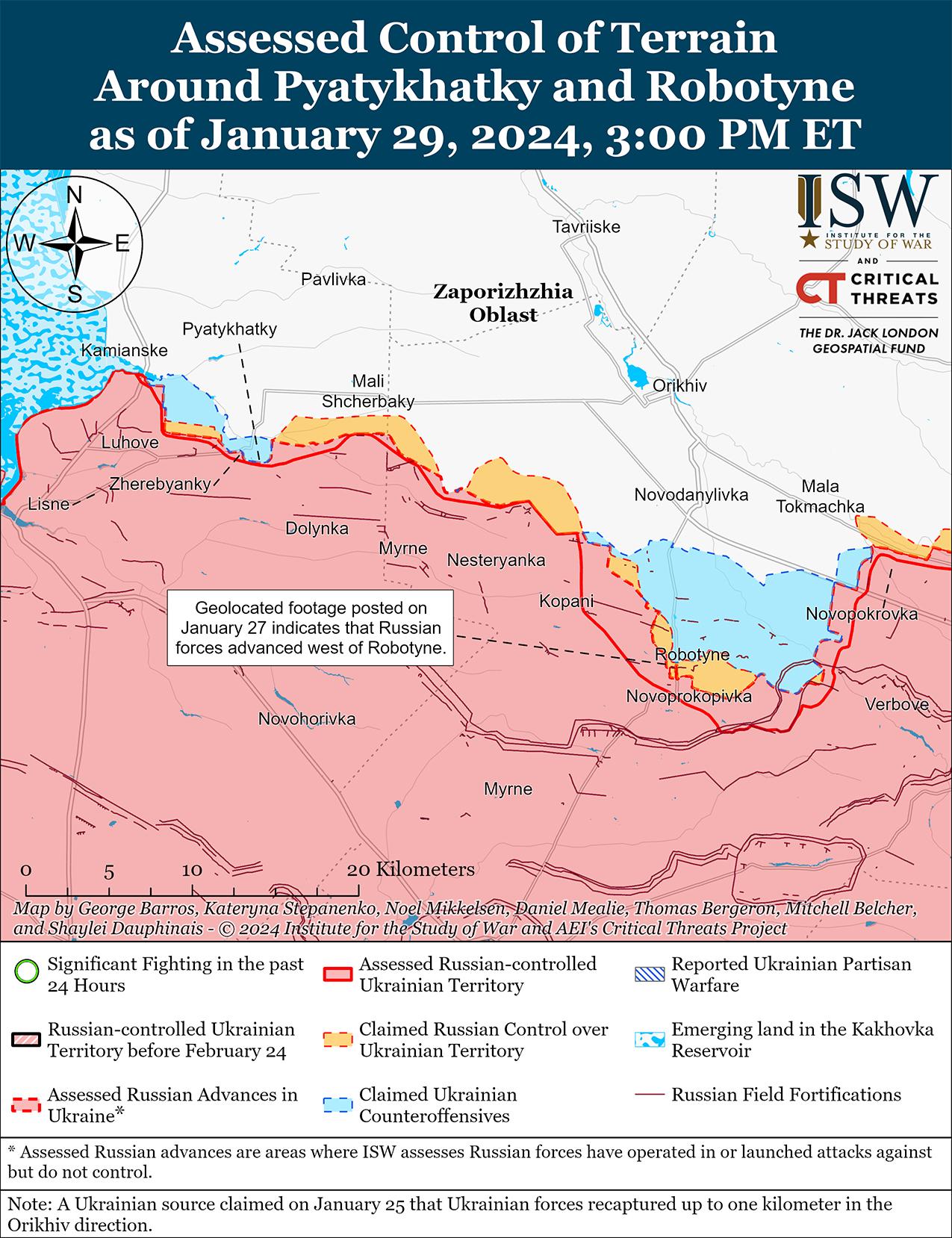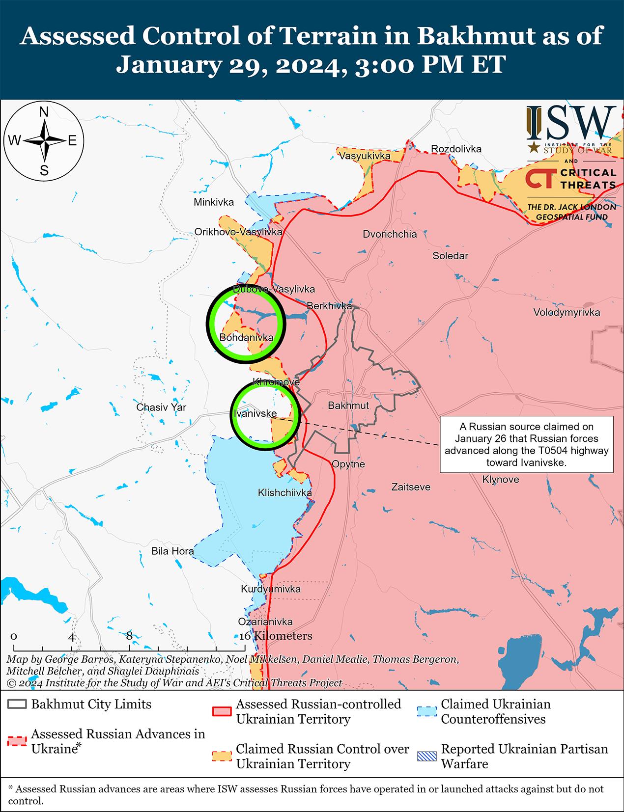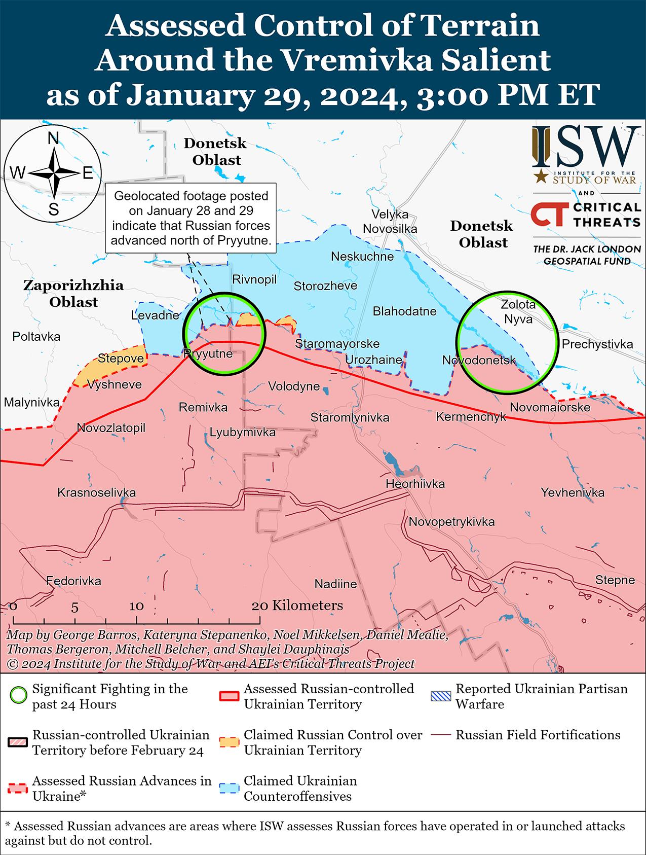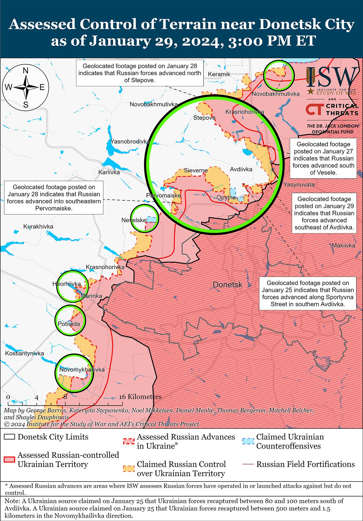 29 января российские войска незначительно продвинулись вблизи Авдеевки на фоне продолжающихся позиционных боев в этом районе. Геолоцированные кадры, опубликованные 29 января, показывают, что российские войска недавно незначительно продвинулись на юго-восточных окраинах Авдеевки. [38] Российские военные блогеры утверждали, что российские войска продвинулись к северо-западу от Авдеевки в районе Степного и к югу от Новокалиново, а также вдоль улицы Ворошилова в Первомайском (юго-запад Авдеевки), хотя ISW не зафиксировал визуальных подтверждений российских успехов на этих участках. [39] Российские и украинские источники сообщали о позиционных боях к северо-западу от Авдеевки в районе Очеретино, Новобахмутовки и Степного; к востоку от Авдеевского коксохимического завода на северо-западной окраине Авдеевки; в районе ресторана «Царская охота» на юго-восточной окраине Авдеевки; западнее Авдеевки в районе Тоненького; и юго-западнее Авдеевки в районе Первомайского и Невельского. [40] По имеющимся сведениям, к юго-востоку от Авдеевки действуют подразделения добровольческой бригады «Пятнашка» Донецкой Народной Республики (ДНР). [41]