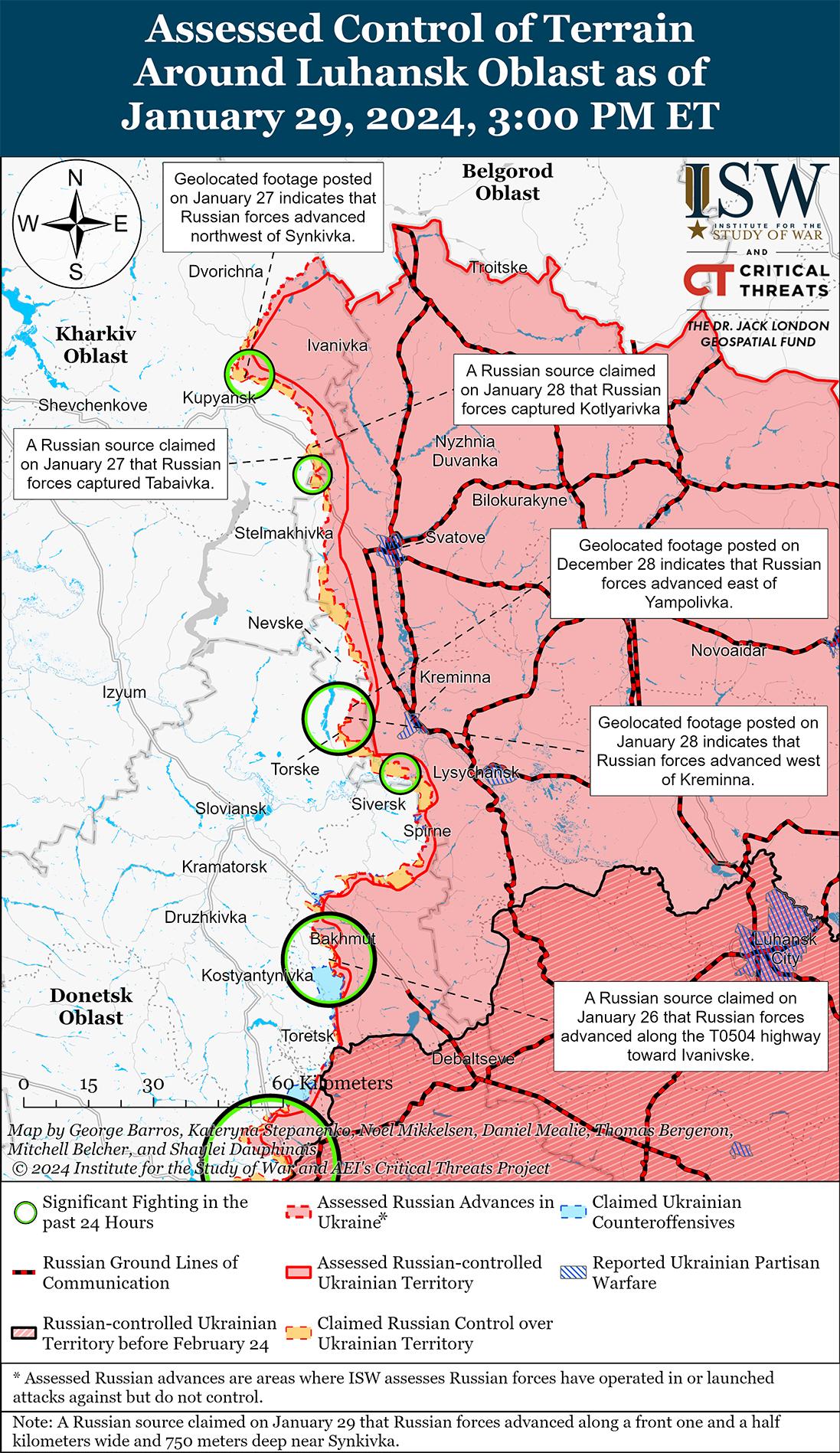 29 января российские и украинские источники продолжали расходиться во мнениях по поводу статуса Табаевки (юго-восточнее Купянска). Министерство обороны (МО) России заявило, что Табаевку захватили подразделения российской Западной группировки войск, и многие российские военные блогеры распространили это заявление. [25] ISW пока не обнаружил визуальных подтверждений предполагаемого захвата Табаевки россиянами, а спикер Сухопутных войск Украины подполковник Владимир Фитё сообщил 29 января, что бои в этом районе продолжаются, но российские войска не захватили населенный пункт. [26] 29 января российский военный блогер заявил, что российские войска продвинулись в районе Синьковки (северо-восточнее Купянска) на 1,5 километра в ширину и 750 метров в глубину, хотя ISW не обнаружил визуальных подтверждений этого российского наступления. [27] Украинские и российские источники сообщали о продолжении позиционных боев к северо-востоку от Купянска в районе Синьковки и к юго-востоку от Купянска в районе Песчаного. [28] Сообщается, что на Купянском направлении продолжают действовать подразделения 6-й общевойсковой армии (Западный военный округ) и 47-й танковой дивизии (1-я гвардейская танковая армия, Западный военный округ). [29]