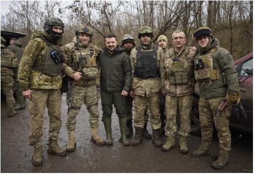 Президент Украины Владимир Зеленский позирует для фото с военнослужащими во время визита в Запорожскую область Украины, 4 февраля 2024 года. (Пресс-служба Президента Украины через AP)