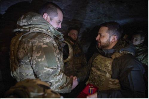 Президент Украины Владимир Зеленский наградил военнослужащего во время визита в Запорожскую область Украины, 4 февраля 2024 года. (Пресс-служба Президента Украины через AP)