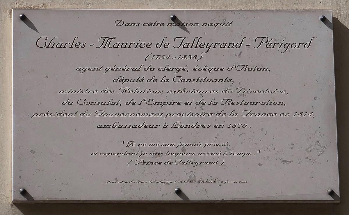 Мемориальная доска в память о Талейране на доме где он родился, фото: Celette / Wikimedia (CC BY-SA 4.0 DEED)