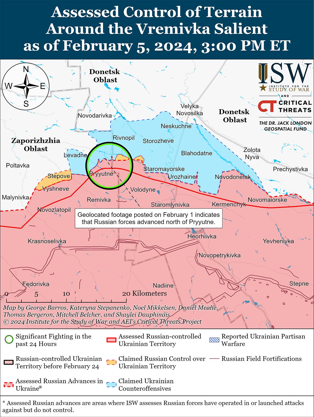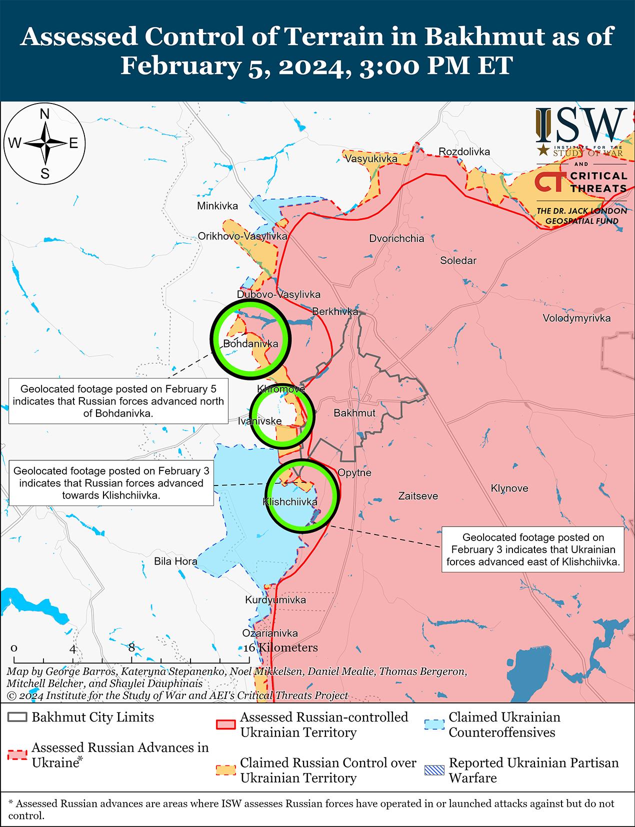 Недавно украинские силы продвинулись в районе Авдеевки на фоне продолжающихся позиционных боев в этом районе 5 февраля. Геолоцированные кадры, опубликованные 5 февраля, свидетельствуют о том, что украинские силы недавно продвинулись к северо-востоку от Невельского (юго-западнее Авдеевки). [43] Российские источники утверждали, что российские войска продвинулись в юго-восточной части Первомайского (юго-западнее Авдеевки) и на глубину до одного километра в северной части Авдеевки, хотя ISW не обнаружил визуальных подтверждений ни того, ни другого. [44] Российские и украинские источники утверждали, что позиционные бои продолжались к северо-западу от Авдеевки в районе Новобахмутовки и Степного; западнее Авдеевки в районе Тоненького и Северного; и юго-западнее Авдеевки в районе Первомайского и Невельского. [45] Сообщается, что подразделения российской 1-й мотострелковой бригады и 110-й мотострелковой бригады (обе входят в состав 1-го АК ДНР) продолжают действовать в районе Авдеевки и Невельского соответственно. [46]