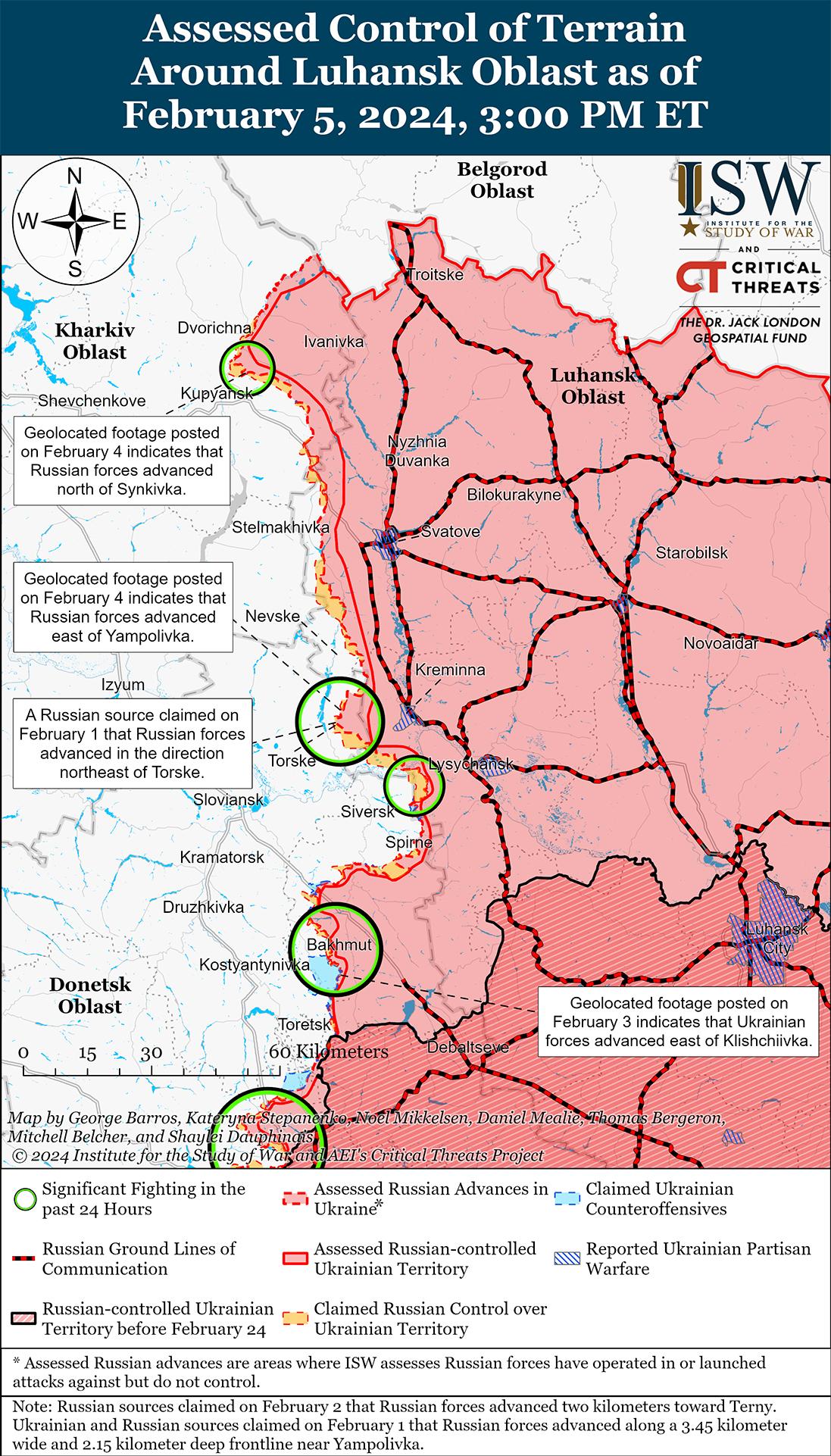 Недавно российские войска незначительно продвинулись к северо-востоку от Купянска и к западу от Кременной на фоне продолжающихся боев на линии Купянск-Сватово-Кременная 5 февраля. На геолоцированных кадрах, опубликованных 4 февраля, видно, что российские войска незначительно продвинулись на севере Синьковки (к северо-востоку от Купянска) и к востоку от Ямполовки (к востоку от Кременной). [32] Продолжались позиционные бои северо-восточнее Купянска в районе Синьковки; западнее Кременной в районе Терны, Торского и Ямполовки; и к югу от Кременной в районе Белогоровки (12 км южнее Кременной) и Григорьевки 5 февраля. [33]