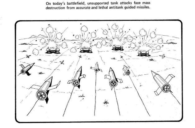 Рисунок руководства армии США 1977 года иллюстрирует опасение перед тем, что управляемые ракеты сделают танки устаревшими, но новая тактика сохранила превосходство танка. АРМИЯ США