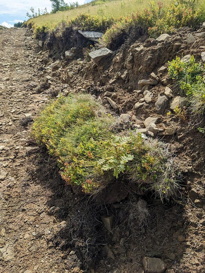 Дорога виходила на вершину хребта, де ліс змінюється альпійськими луками, і простягалася ще кілометрів на шість. Тут важка техніка пошкодила яфинники, тобто зарості чорниці. А подекуди на схилах було видно сліди ерозії, або, простими словами, подальшого руйнування пошкодженого ґрунту.