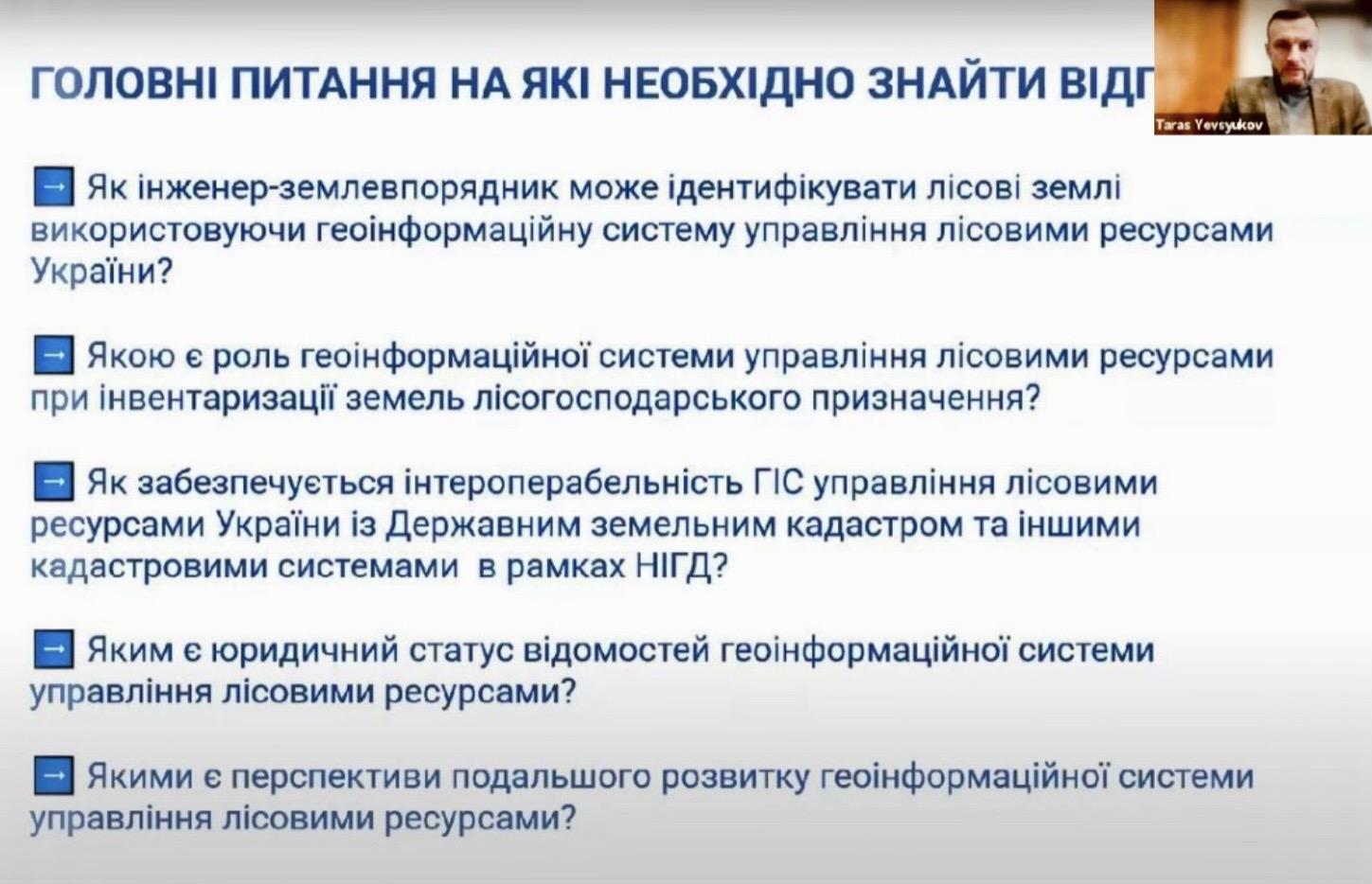 - Як забезпечується інтероперабельність ГІС управління лісовими ресурсами України із Державним земельним кадастром та іншими кадастровими системами в рамках Національної інфраструктури геопросторових даних?