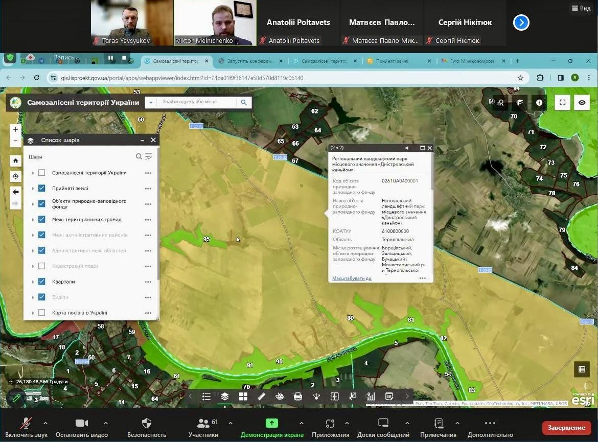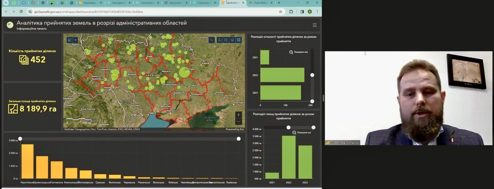 В обговоренні питання взяв участь генеральний директор Українського державного проектного лісовпорядного виробничого об’єднання Віктор Мельниченко. Віктор Анатолійович ознайомив учасників дискусії з програмним продуктом – «Геоінформаційна система управління лісовими ресурсами України», що розроблена для низки завдань зокрема, проведення національної інвентаризації лісів, ідентифікації самозалісених ділянок, аналізу наслідків російської агресії на лісові ресурси тощо. Звісно, очільник «Укрдержліспроект» продемонстрував роботу цієї геоіноформаційної системи. Її впровадження значно розширює можливості отримання детальної інформації про окремі ділянки лісів. Після виявлення самозалісненої ділянки проводяться виїзди на місцевість із залучення представників органів місцевого самоврядування, інженерів-землевпорядників, розробляється документація із землеустрою та надання в користування лісогосподарським підприємствам. Допоки немає правовстановлюючих документів на земельні ділянки лісогосподарських підприємств, вони використовують за основу матеріали лісовпорядкування. Крім того, геоінформаційна система лісових ресурсів відображає інформацію про природно-заповідний фонд, аналітику самозаліснених територій в розрізі областей, інформацію про самозаліснені ділянки, на які підготовлені клопотання про передачу їх в постійне користування лісогосподарським підприємствам, дашборд наслідків російської агресії (13 тис. кварталів, які забруднені вибухонебезпечними предметами, 728 тис. га лісу були в окупації), шар затопленої Каховської дамби (близько 80 тис. га затоплених земель лісокористувачів), інформація про заміновані землі в розрізі областей і територіальних громад. Також Віктор Анатолійович продемонстрував прототип кадастру лісового кадастру України та аналітичний кейс в розрізі територіальних громадах.