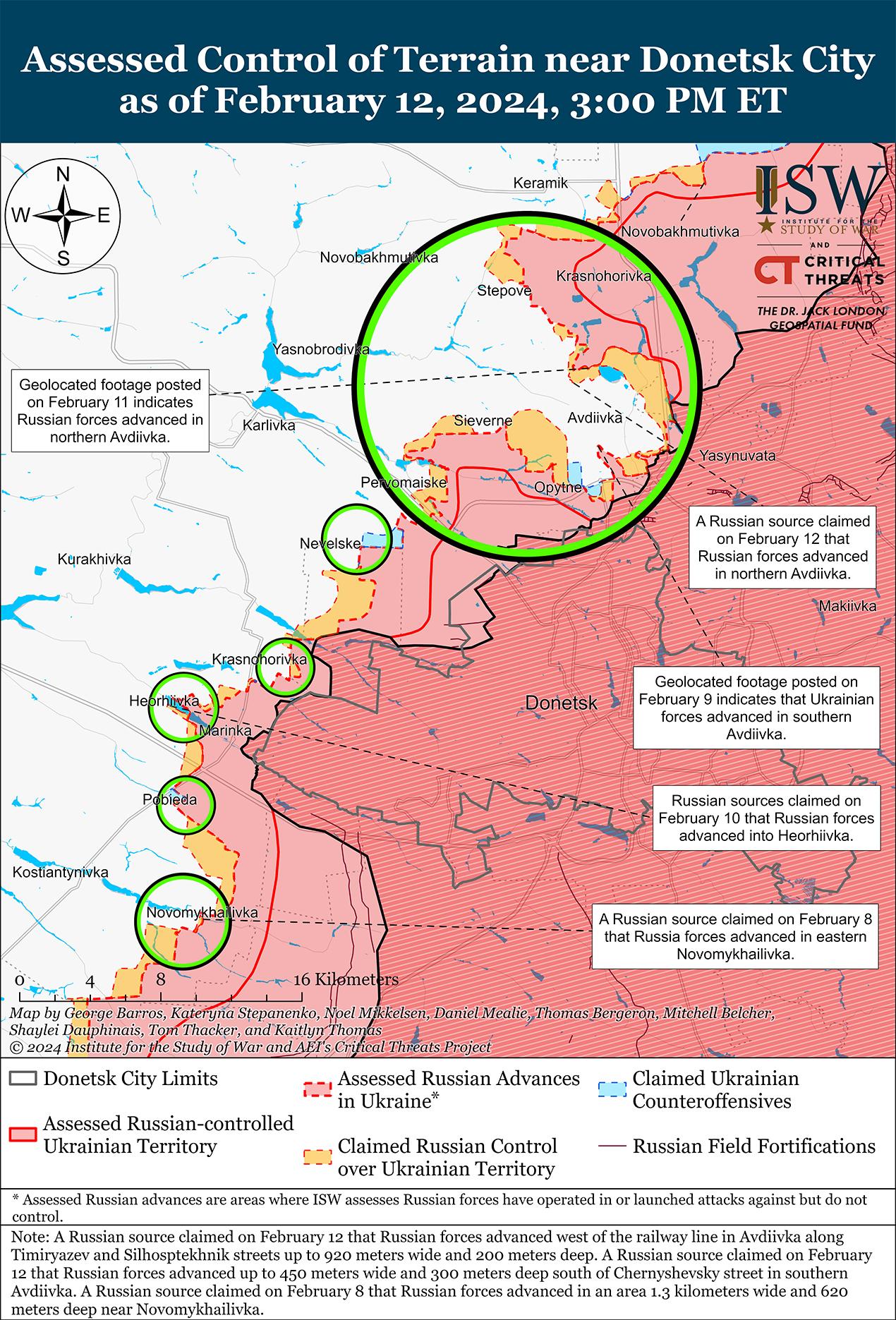 Недавно украинские силы незначительно продвинулись к юго-западу от Донецка на фоне продолжающихся позиционных боев к западу и юго-западу от города 12 февраля. На геолоцированных кадрах, опубликованных 11 февраля, видно, что украинские войска незначительно продвинулись к северо-востоку от Победы (к юго-западу от Донецка). [30] Один известный российский военный блогер утверждал, что российские войска продвинулись вдоль трассы Т0524 Угледар-Победа в сторону Победы и захватили дополнительные позиции непосредственно к югу от населенного пункта, а другой военный блогер утверждал, что российские войска продвинулись во фланг населенного пункта. [31] Продолжались позиционные бои вблизи Красногоровки, Георгиевки, Победы и Новомихайловки. [32] Сообщается, что на Кураховском направлении к западу от Донецка действуют подразделения российской 150-й мотострелковой дивизии (8-я общевойсковая армия, Южный военный округ); сообщается, что подразделения 5-й мотострелковой бригады (1-й армейский корпус Донецкой Народной Республики [ДНР]) действуют на направлении Красногоровка – Георгиевка (также западнее Донецка); сообщается, что подразделения батальона «Тигр» 255-го мотострелкового полка (20-я гвардейская мотострелковая дивизия, 8-я ОА) действуют в районе населенных пунктов Победа и Новомихайловка (юго-западнее Донецка); сообщается, что подразделения 155-й бригады морской пехоты (Тихоокеанский флот) действуют в районе Новомихайловки (юго-западнее Донецка). [33]