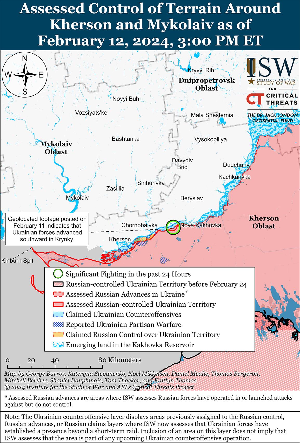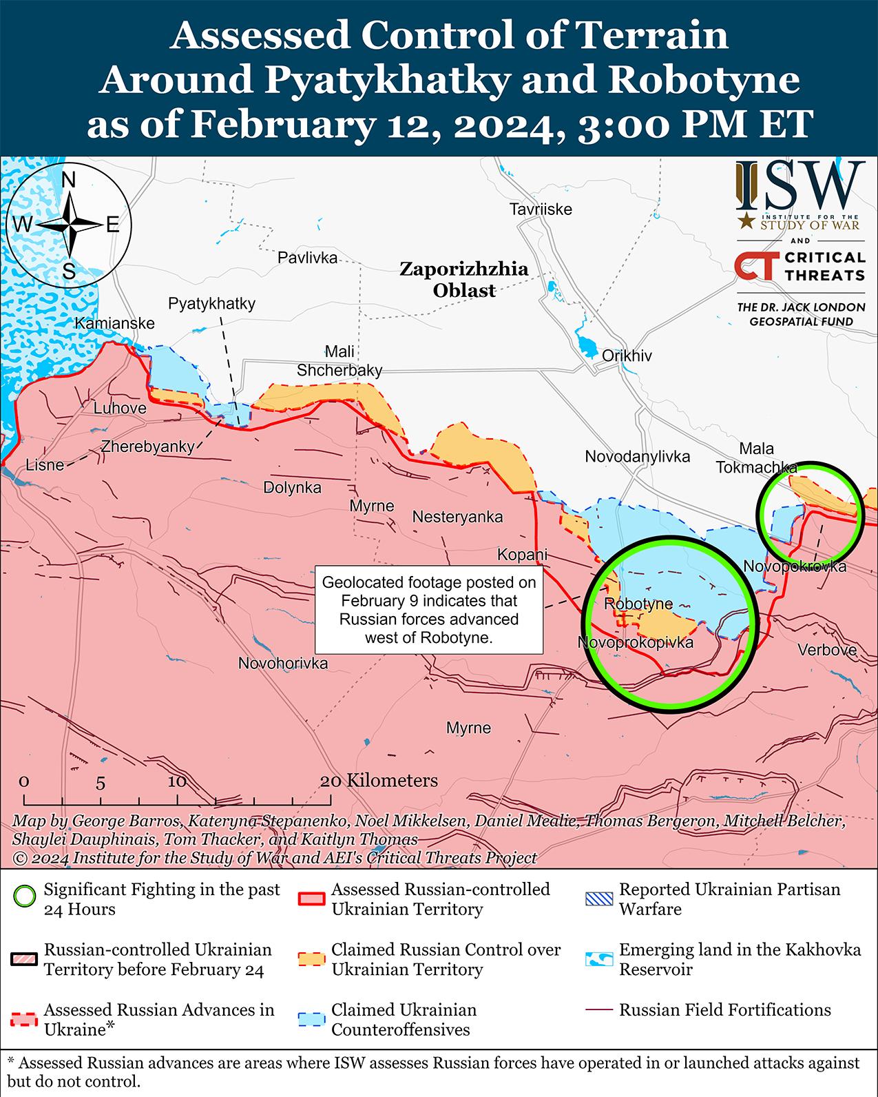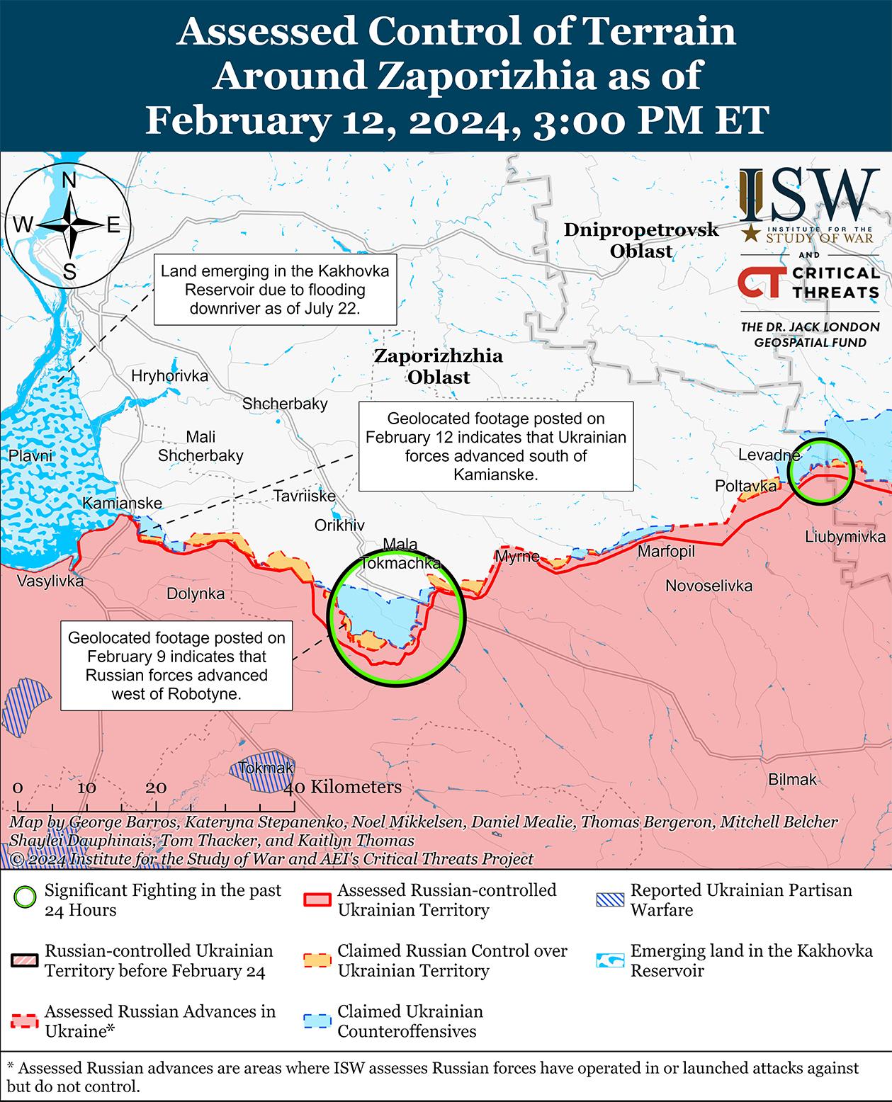 12 февраля украинские силы подтвердили наступление на западе Запорожской области на фоне продолжающихся позиционных боев в этом районе. Геолоцированные кадры, опубликованные 12 февраля, показывают, что украинские войска продвинулись к западу от Пятихаток (28 км к северо-западу от Работино) в районе Каменского, хотя это наступление, скорее всего, было недавним. [36] Российский военный блогер утверждал, что российские войска продвинулись в районе Новопрокоповки (к югу от Работино), однако ISW не обнаружил визуальных подтверждений этому заявлению. [37] Генштаб ВСУ заявил, что российские войска безуспешно атаковали вблизи Работино и Новопокровки (северо-восточнее Работино). [38] Сообщается, что на Запорожском направлении действуют подразделения 42-й мотострелковой дивизии (58-я общевойсковая армия, Южный военный округ), в районе Каменского – подразделения российского 1152-го мотострелкового полка (58-й ОА), к югу от Каменского. [39]