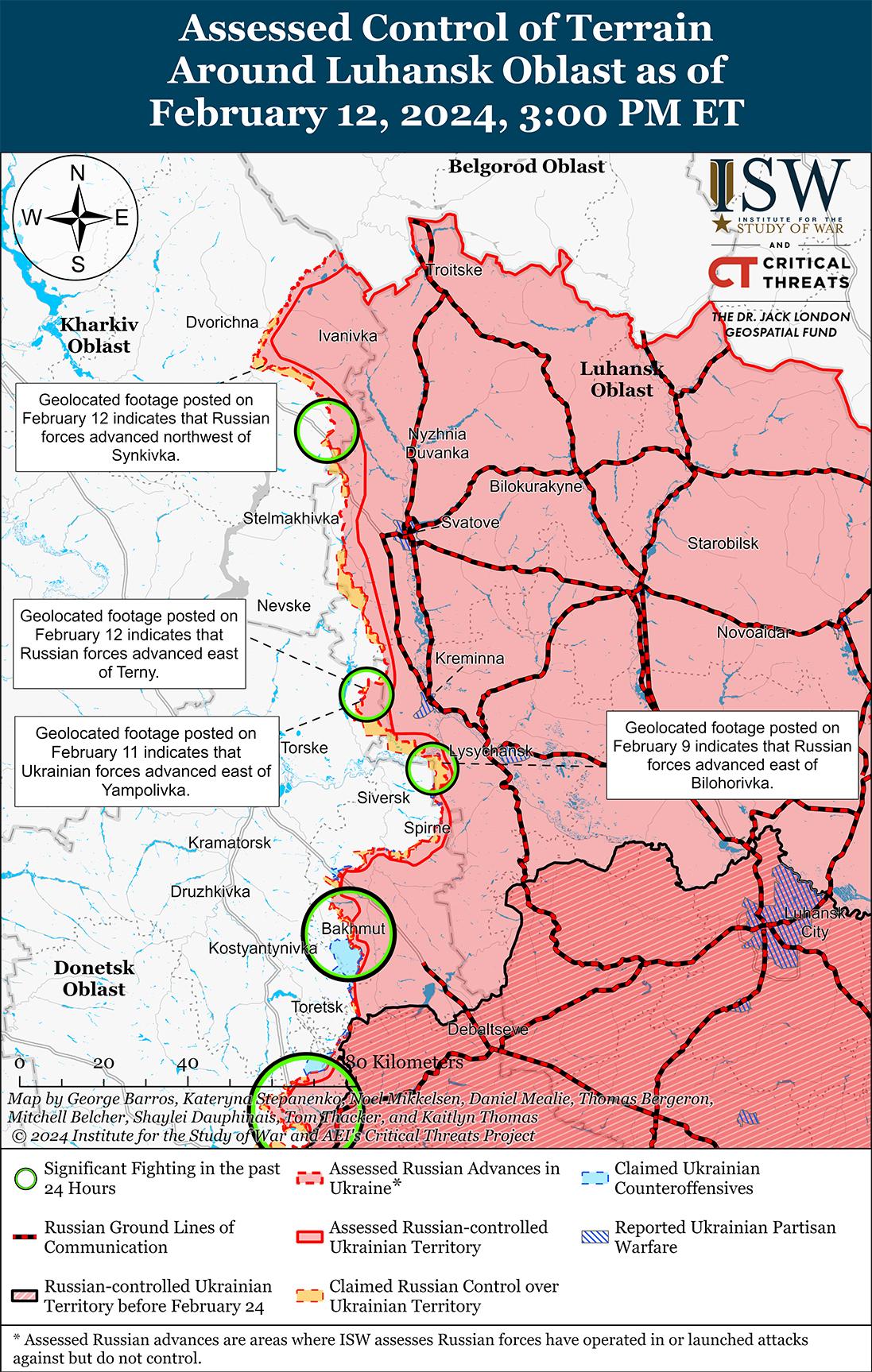 Российские и украинские войска недавно добились подтвержденных успехов на линии Купянск-Сватово-Кременная. На кадрах, опубликованных 12 февраля, видно, что российские войска незначительно продвинулись к северо-западу от района Синьковка-озеро Лиман (северо-восточнее Купянска). [16] На дополнительных геолокационных кадрах, опубликованных 12 февраля, видно, что российские войска незначительно продвинулись к востоку от Терны (к западу от Кременной) и в настоящее время действуют в двух километрах от окраин самого Терны. [17] На кадрах, опубликованных 11 февраля, видно, что украинские силы восстановили некоторые тактические позиции примерно в трех километрах к востоку от Ямполовки (к западу от Кременной). [18] Украинские и российские источники сообщали о продолжении позиционных боев к северо-востоку от Купянска в районах населенных пунктов Ивановка, Синьковка и Лиманское озеро; юго-восточнее Купянска в районе Табаевки и Тымковки; западнее Кременной в районе Терны и Ямполовки; юго-западнее Кременной возле Дибровы; и южнее Кременной возле Белогоровки. [19] Российский военный блогер утверждал, что российские войска выбили украинские войска с некоторых позиций на западе Белогоровки, хотя ISW не обнаружил визуальных доказательств этого заявления. [20] Сообщается, что подразделения 4-й гвардейской танковой дивизии (1-я гвардейская танковая армия, Западный военный округ) и 7-й мотострелковой бригады (2-й армейский корпус ЛНР) действуют в районе Сватово и Белогоровки соответственно. [21]