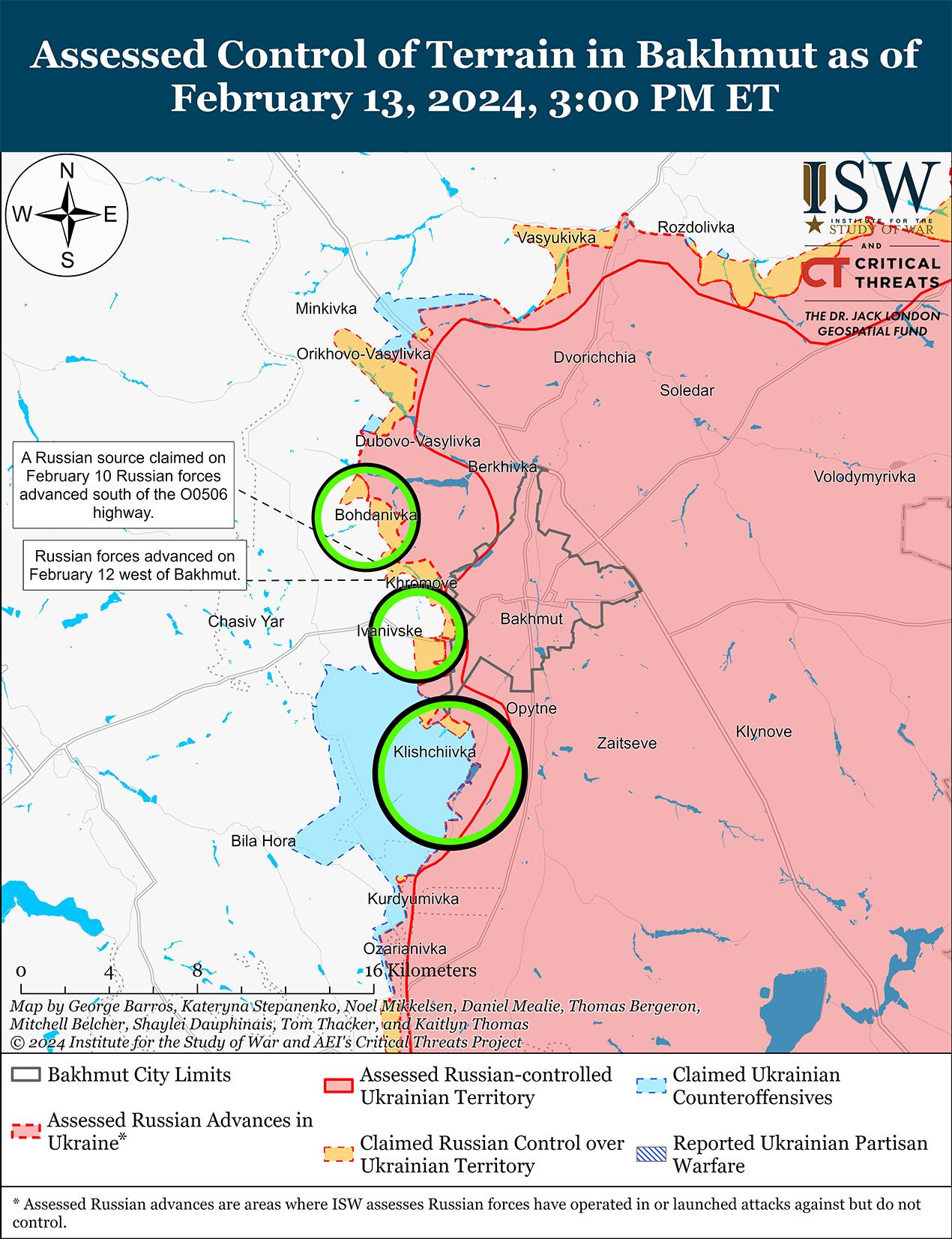Сообщается, что 13 февраля российские войска продвинулись к западу от Бахмута на фоне продолжающихся позиционных боев в этом районе. Спикер украинской бригады, действующей в районе Бахмута, заявил, что российские войска частично продвигаются в районе Богдановки (северо-запад Бахмута) и захватывают целые ветрозащитные полосы или лесные массивы вблизи населенного пункта. [40] По словам украинского пресс-секретаря, российские военные блогеры ложно утверждают, что российские войска продвинулись в двух километрах от Часового Яра (к западу от Бахмута). [41] 12 и 13 февраля российские военные блогеры утверждали, что подразделения 98-й воздушно-десантной дивизии (ВДВ), в том числе подразделения 331-го полка ВДВ, продвинулись в направлении Богдановки к западу от трассы О0506 (Хромово-Часовой Яр) и в направлении Ивановского (западнее Бахмута). [42] Продолжались позиционные бои северо-восточнее Бахмута в районе Белогоровки и Веселого, северо-западнее Бахмута в районе Богдановки, западнее Бахмута в районе Ивановского, юго-западнее Бахмута в районе Клещеевки и Андреевки, к югу от Бахмута в районе Шумов и Южного. [43] Сообщается, что на Бахмутском направлении действуют подразделения российской 83-й бригады ВДВ и 106-й дивизии ВДВ. [44]