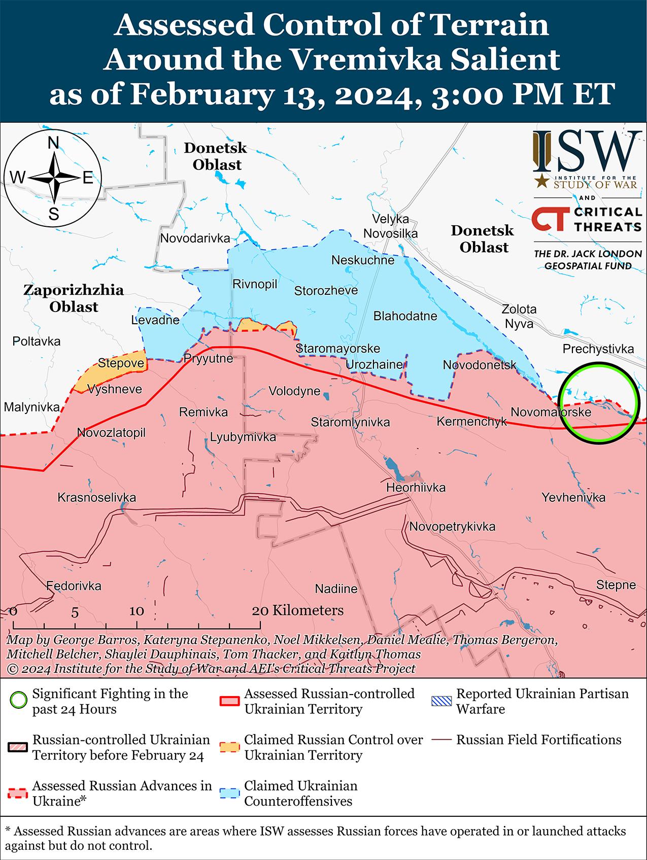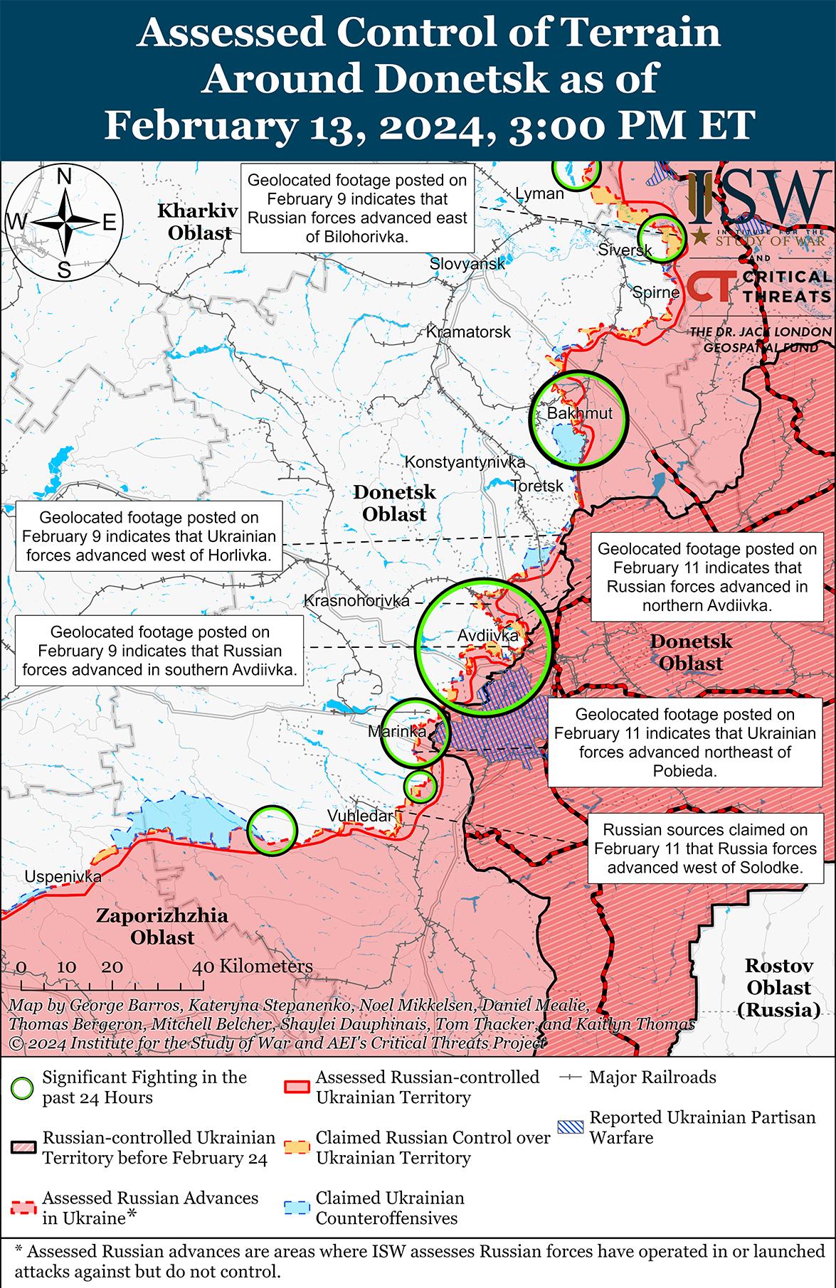 Сообщается, что 13 февраля российские войска продолжали наступление в Авдеевке на фоне продолжающихся позиционных боев в этом районе. Российские военные блогеры утверждали, что российские войска продвинулись в северной и центральной части Авдеевки, а также на юго-восточных и южных окраинах населенного пункта, хотя ISW пока не обнаружил подтверждения дальнейших успехов россиян в Авдеевке. [45] Российские военные блогеры утверждали, что российские войска продвинулись к западу от Авдеевки в районе Ласточкино и к юго-западу от Авдеевки в районе Первомайского, однако ISW также не обнаружил подтверждения этим заявлениям. [46] Продолжались позиционные бои в районе Авдеевки, к западу от Авдеевки в районе Тоненького и юго-западнее Авдеевки в районе Невельского и Первомайского. [47] Командующий украинской Таврийской группировкой войск бригадный генерал Александр Тарнавский заявил, что российские войска усиливают наступление на Таврийском направлении (Авдеевка через запад Запорожской области) и нанесли наибольшее количество авиационных и артиллерийских ударов в этом районе с начала 2024 года. [48] 13 февраля российские военные заявляли, что за минувшие сутки российские войска нанесли до 60 ударов планирующими бомбами по украинским позициям в Авдеевке. [49] Сообщается, что на Авдеевском направлении действуют подразделения российской 1-й «Славянской» мотострелковой бригады (1-й армейский корпус Донецкой Народной Республики). [50]