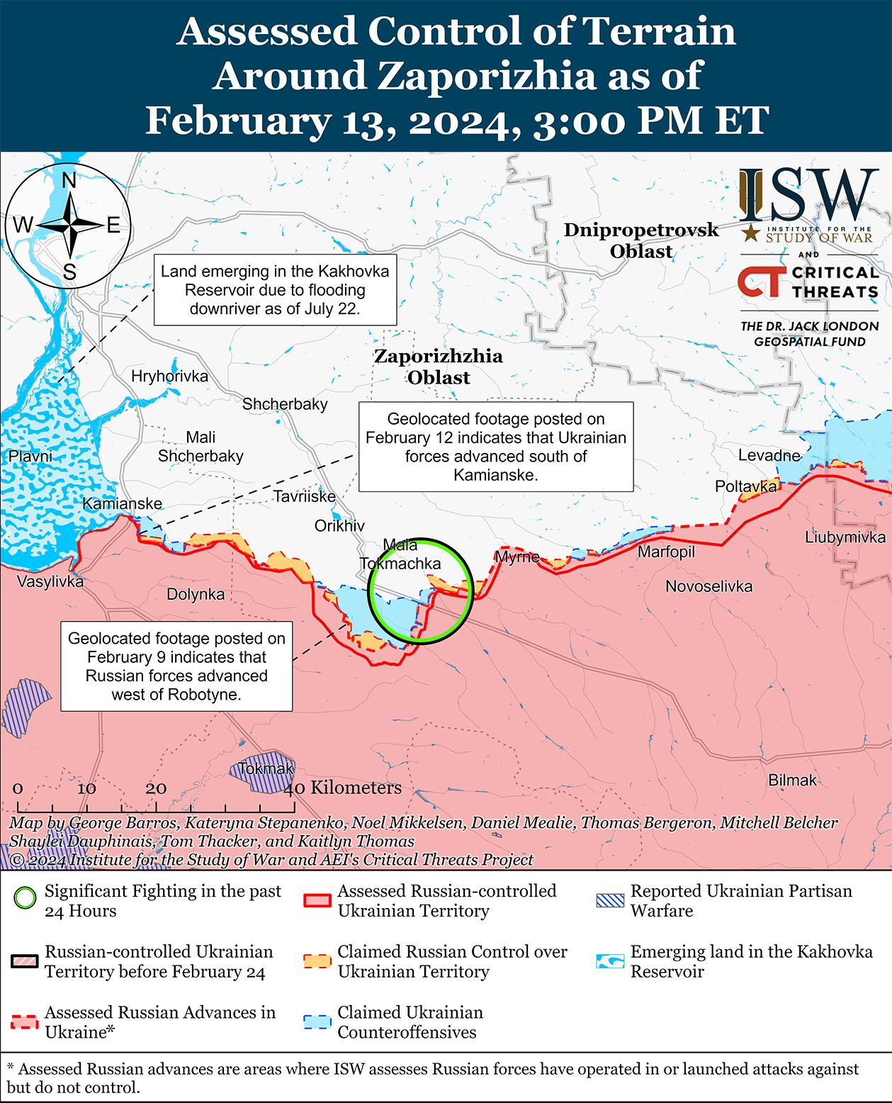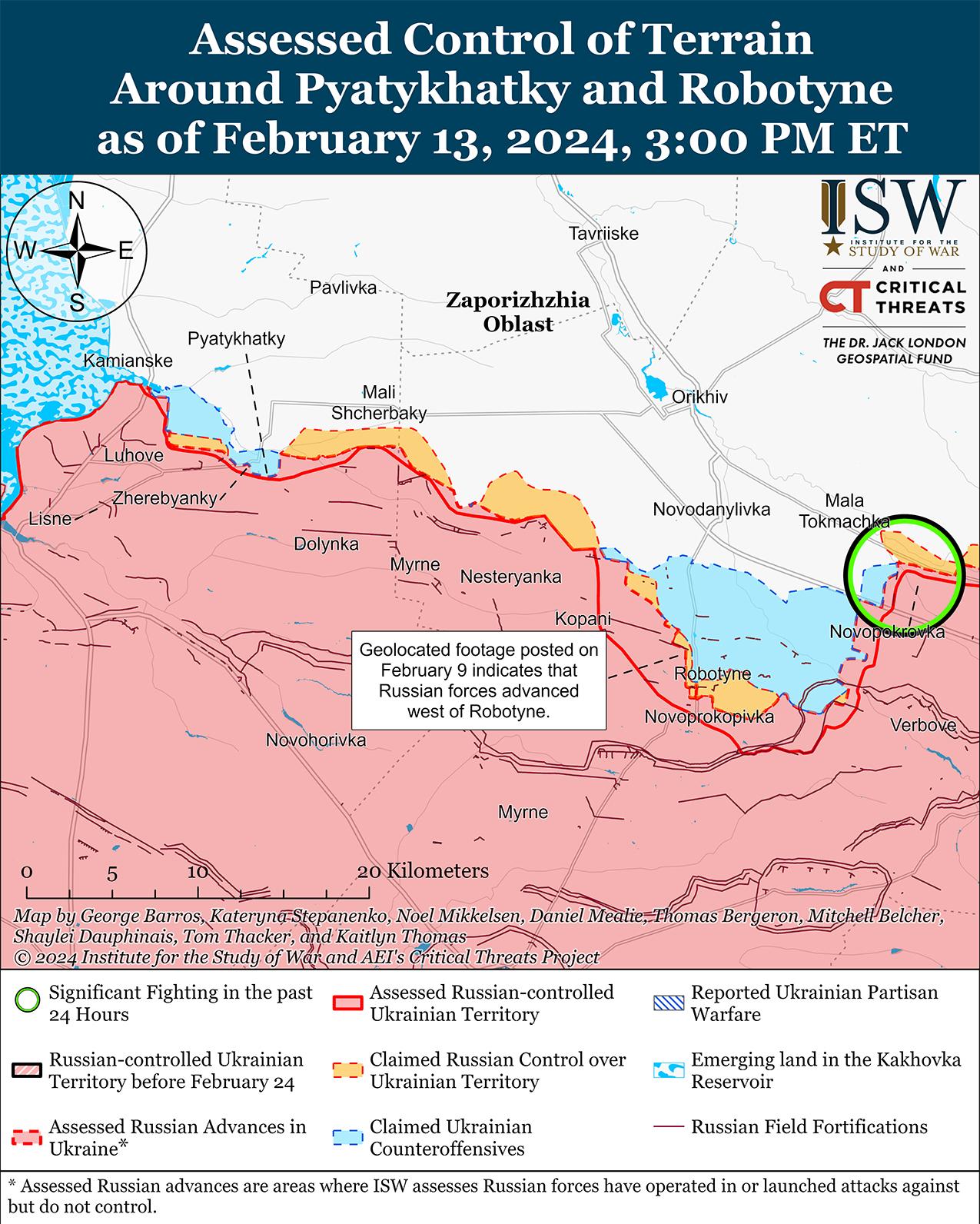 Российские войска недавно продвинулись на западе Запорожской области на фоне продолжающихся позиционных боев 13 февраля. Геолоцированные кадры, опубликованные 12 февраля, показывают, что российские войска недавно продвинулись к западу от Работино. [55] Российские и украинские источники сообщали, что позиционные бои продолжались в районе Работино, северо-восточнее Работино в районе Малой Токмачки и Новопокровки, к востоку от Работино в районе Вербового и к югу от Работино в районе Новопрокоповки. [56] Сообщается, что подразделения российского 71-го мотострелкового полка (42-я мотострелковая дивизия, 58-я общевойсковая армия, Южный военный округ) продолжают действовать в районе Работино. [57]