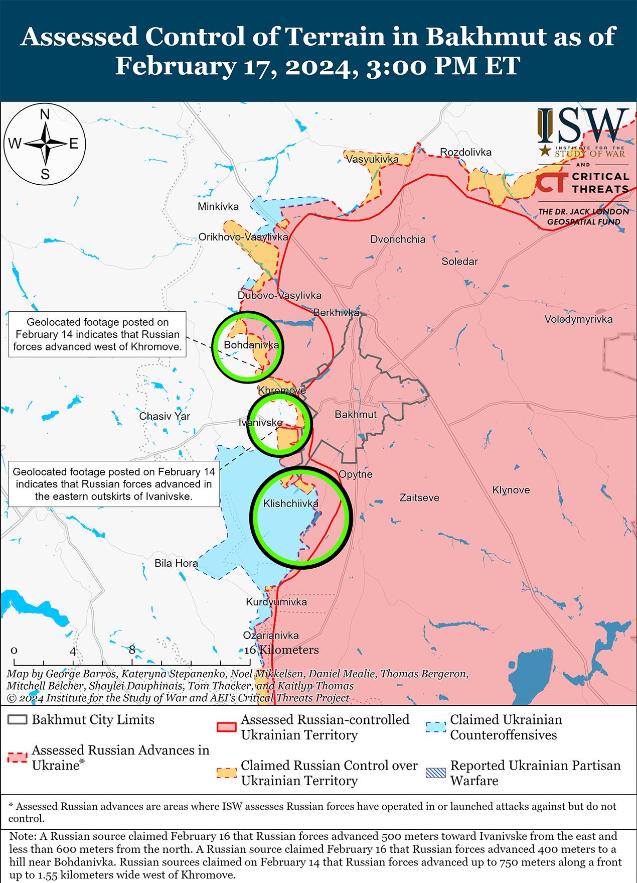 По состоянию на 17 февраля российские войска незначительно продвинулись под Бахмутом. На геолоцированных кадрах, опубликованных 17 февраля, видно, что российские войска незначительно продвинулись к юго-востоку от Богдановки (северо-западнее Бахмута). [40] Российский блогер утверждал, что российские войска недавно продвинулись в направлении Ивановского (западнее Бахмута) в 600 метрах с севера и в 500 метрах с востока. [41] Другой блогер утверждал, что российские войска незначительно продвинулись в районе Выемки (северо-восточнее Бахмута). [42] ISW не обнаружил подтверждения ни одного из российских заявлений. Продолжались позиционные бои вблизи Богдановки и Ивановского; юго-западнее Бахмута в районе Клещеевки и Андреевки; и к югу от Бахмута в районе Южного и Нью-Йорка. [43]