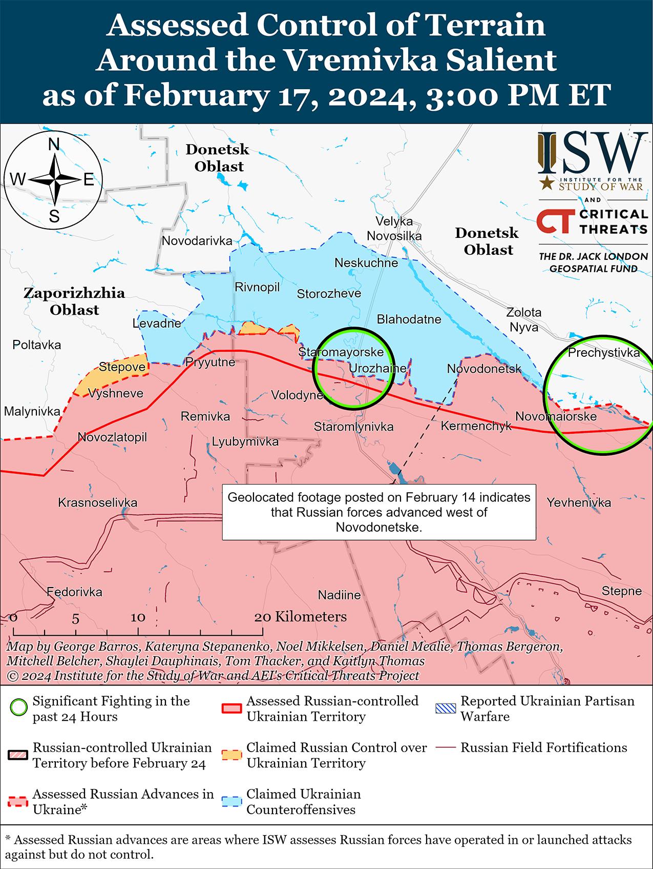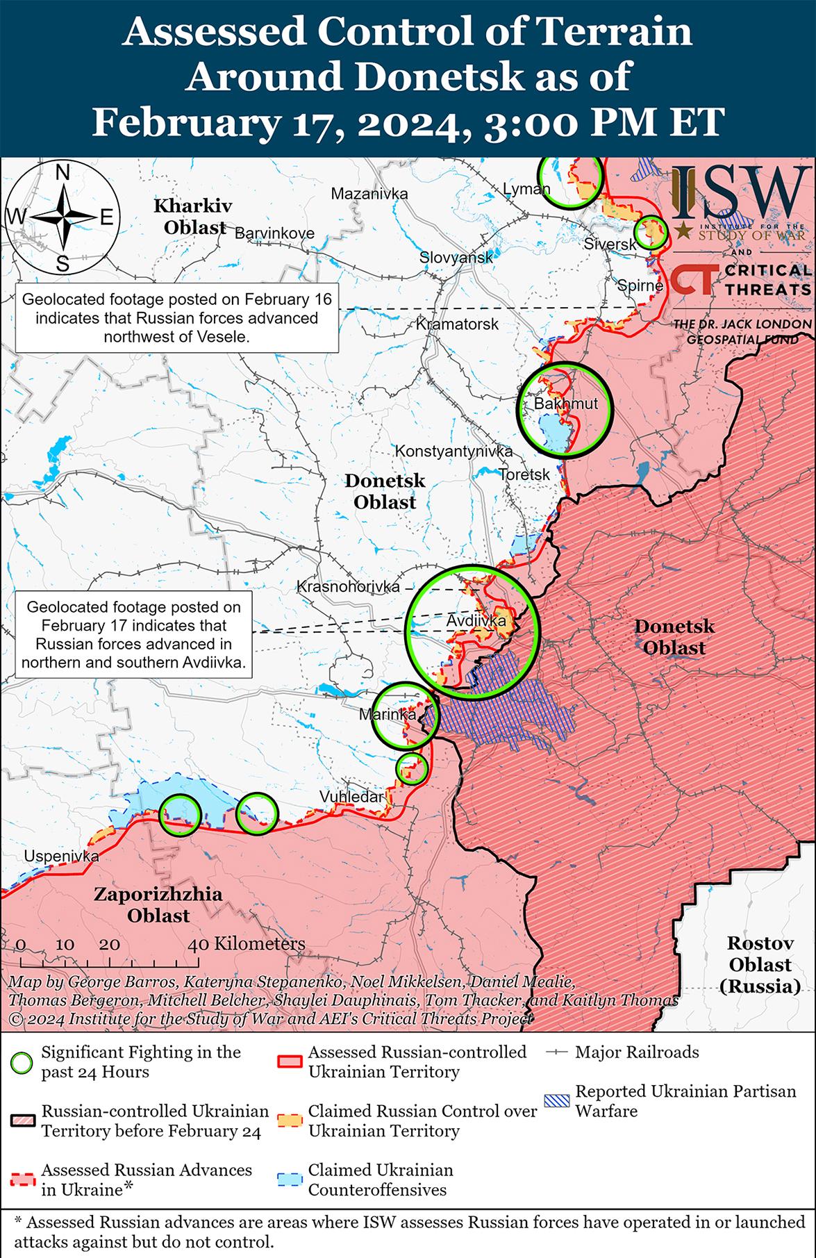 На геолоцированных кадрах, опубликованных 17 февраля, видно, что российские войска продвинулись на север Авдеевки вдоль железнодорожной линии, в восточной части Авдеевского коксохимического завода и в промышленной зоне возле Авдеевского карьера на северо-востоке Авдеевки. [3] На дополнительных геолоцированных кадрах видно, что российские войска продвинулись в центр Авдеевки с юга и захватили здания городской администрации и Дворца культуры. [4] Российские военные блогеры в основном утверждали, что российские войска захватили большую часть Авдеевки, за исключением некоторых западных окраин, и продвинулись до Ласточкино (к западу от Авдеевки), хотя некоторые известные военные блогеры утверждали, что очаги украинских войск остаются в западной части Авдеевского коксохимического завода, в микрорайоне «Химик» на юго-западе Авдеевки и в жилом районе на юго-востоке Авдеевки. [5]