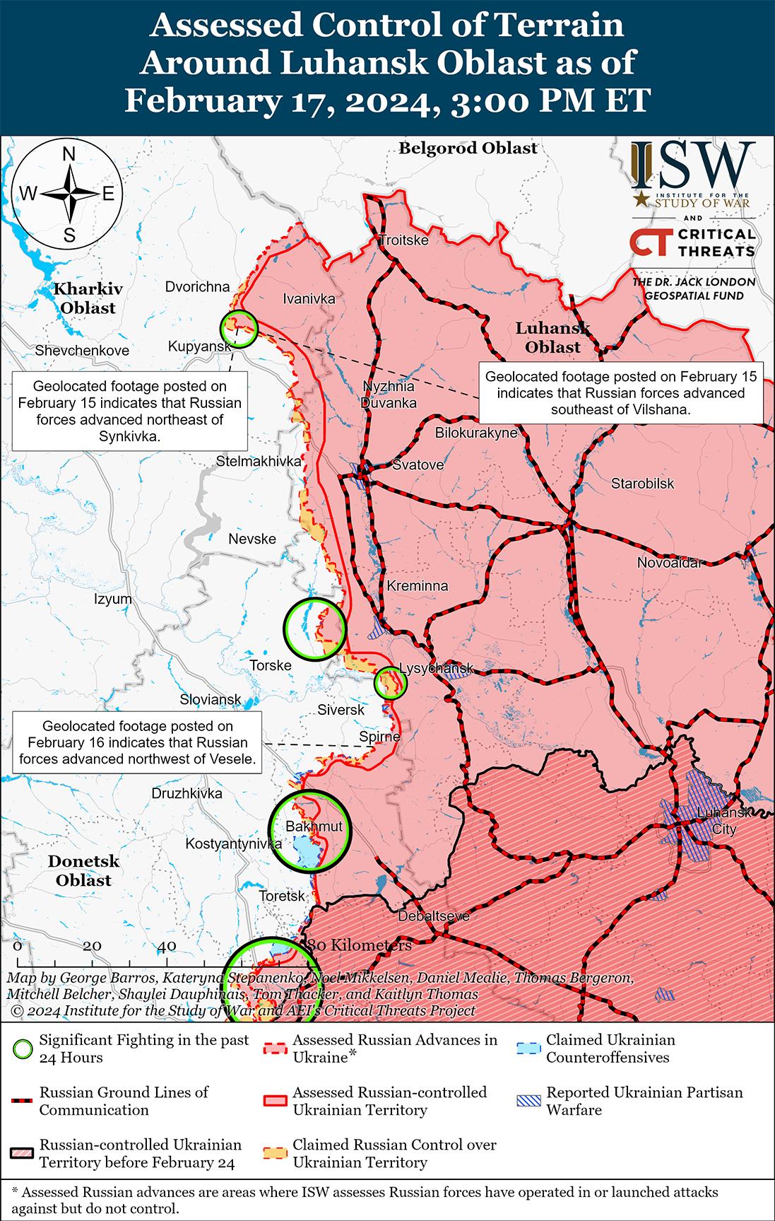 Сообщается, что 17 февраля российские войска продвинулись к западу от Кременной на фоне продолжающихся позиционных боев вдоль линии Купянск-Сватово-Кременная. Российский военный блогер заявил, что российские войска продвинулись к востоку от Терны (к западу от Кременной), хотя ISW не обнаружил визуального подтверждения этого заявления. [36] Продолжались позиционные бои северо-восточнее Купянска в районе Синьковки; западнее Кременной в районе Терны, Ямполовки и Торского; и южнее Кременной возле Белогоровки. [37] 17 февраля пресс-секретарь украинской бригады, действующей на Купянском направлении, заявил, что российские войска продолжают перебрасывать в этот район новый личный состав и технику с целью проведения ротаций тактического уровня и восполнения потерь. [38] Украинские официальные лица сообщали, что российские войска нанесли удар по Купянску до 12 планирующих бомб. [39]