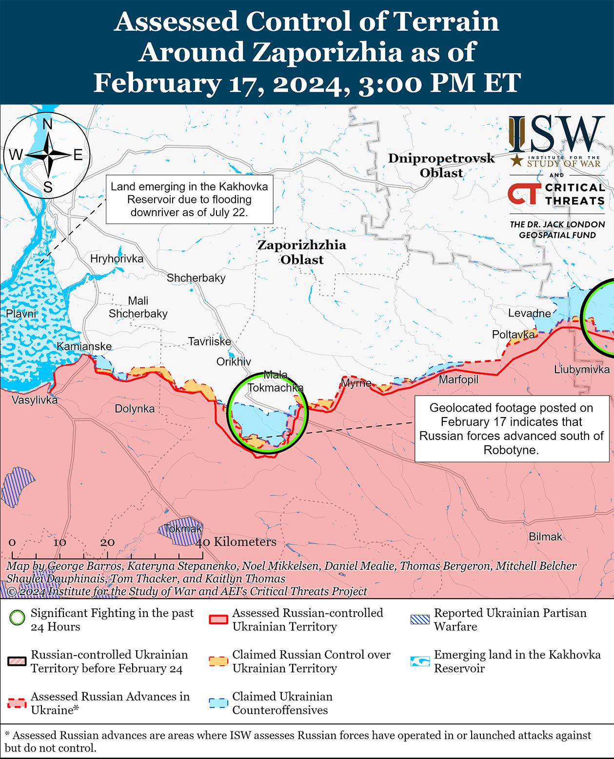 Российские войска недавно подтвердили наступление на западе Запорожской области на фоне участившихся заявлений России о том, что российские войска возобновили наступательные действия на этом участке фронта. На геолоцированных кадрах, опубликованных 17 февраля, видно, что российские войска отбили позицию к югу от Работино. [49] Несколько российских военных блогеров утверждали, что российские войска возобновили наступление в направлении Работино и в настоящее время активно штурмуют населенный пункт, при этом некоторые военные утверждают, что российские войска продвинулись до западных окраин Работино. [50] Один из блогеров утверждал, что российские воздушно-десантные войска (ВДВ) начали наступательную операцию в районе Работино неделю назад и продвинулись на 1,5 километра. [51] ISW пока не обнаружил визуальных доказательств российских успехов в самом Работино, а также российских наступательных приготовлений или активизации в этом районе. Некоторые российские военные блогеры опровергли утверждения об активизации наступления в районе Работино и сообщили, что российские войска только активизировали авиацию и артиллерию, а не наземные атаки. [52] Генштаб Вооруженных сил Украины сообщал, что враг вел безуспешные атаки вблизи населенных пунктов Работино, Вербовое (восточнее Работино) и Малой Токмачки (северо-восточнее Работино). [53] Сообщается, что в районе Работино действуют подразделения российских 70-го и 71-го мотострелковых полков (42-й мотострелковой дивизии, 58-й общевойсковой армии, Южного военного округа), а также 7-й и 76-й дивизий ВДВ. [54] Сообщается, что подразделения российской 49-й специальной воздушно-десантной бригады (недавно сформированная бригада, которая, по имеющимся данным, подчиняется 58-й ОА) готовятся к штурму в районе Каменского, примерно в 35 км к северо-западу от Работино. [55]
