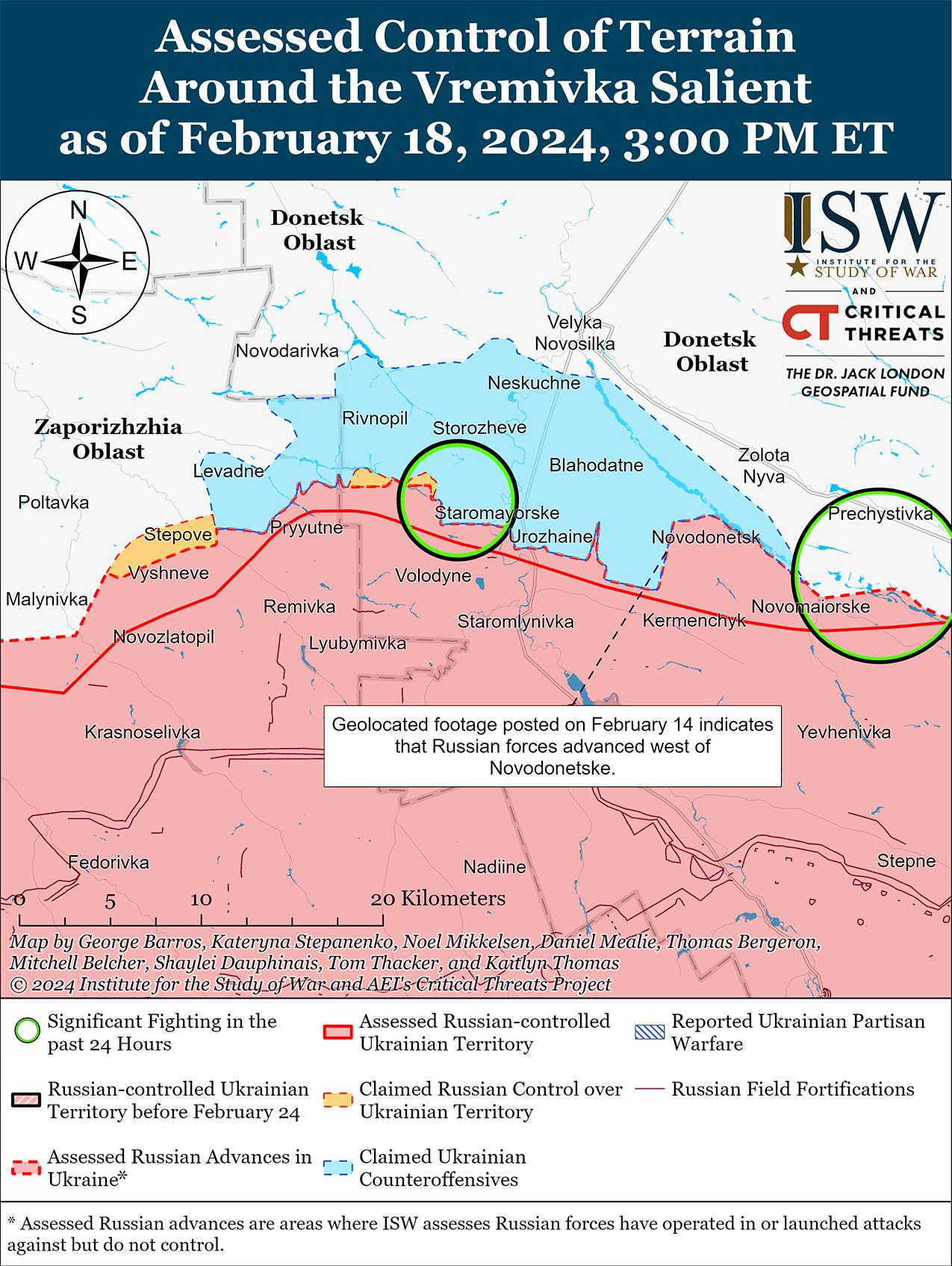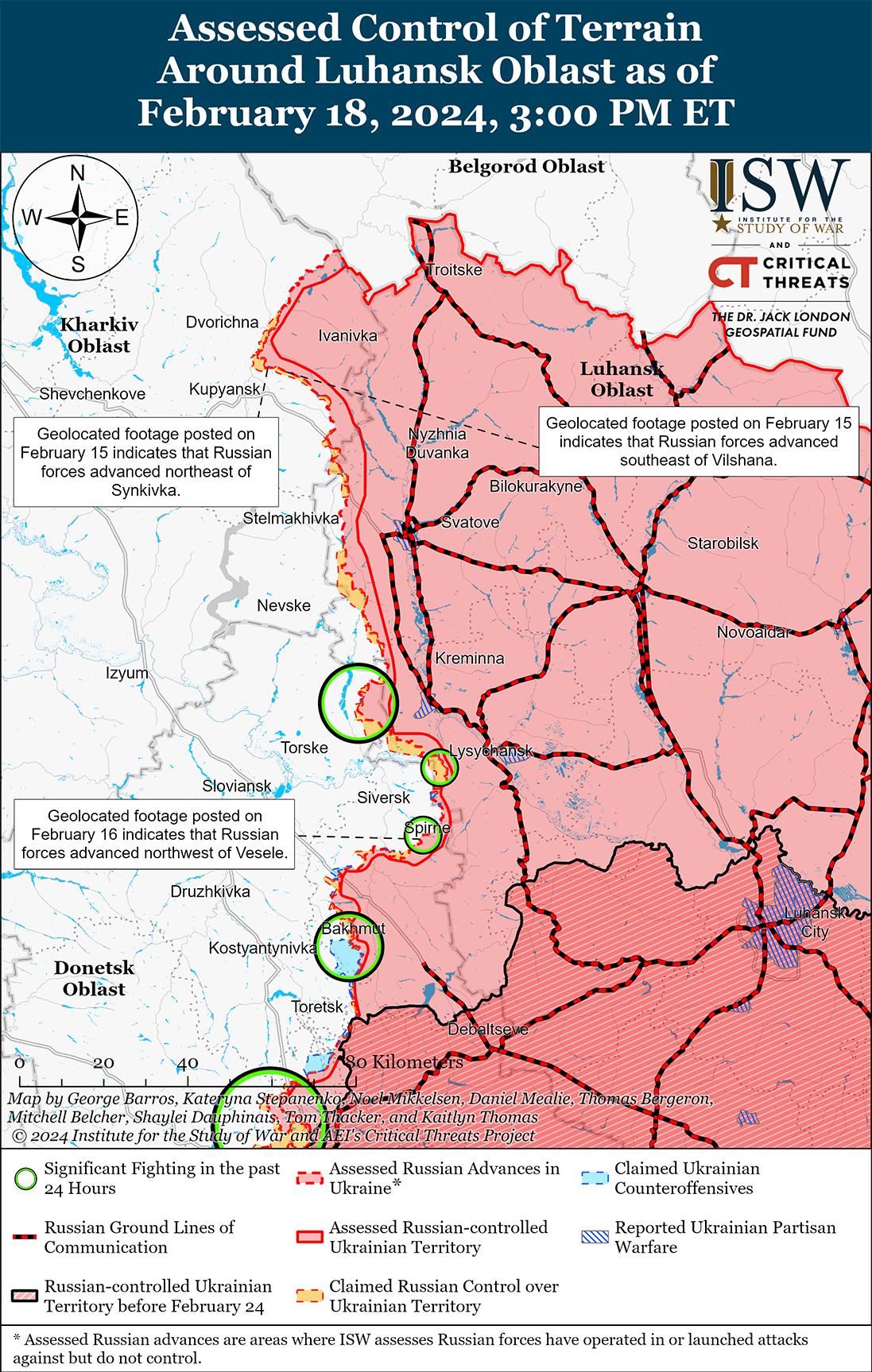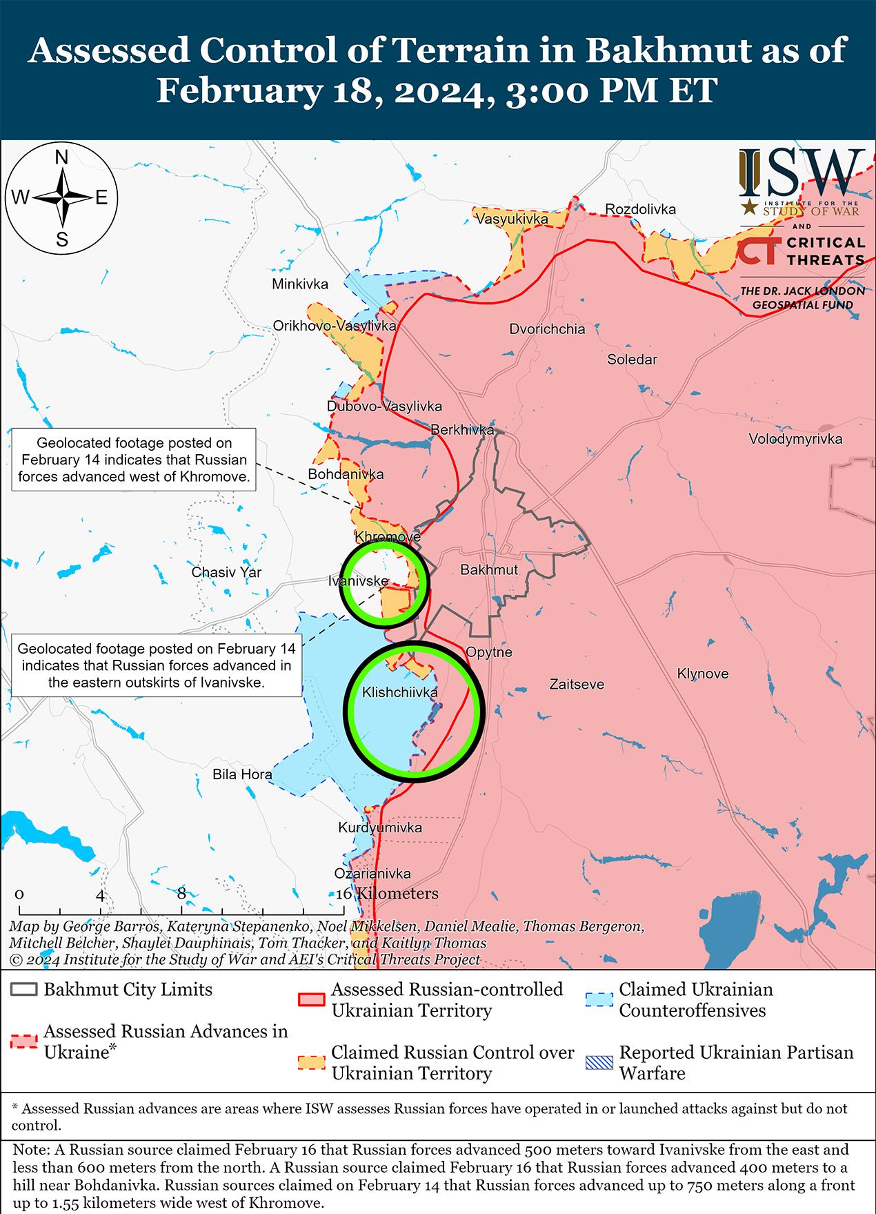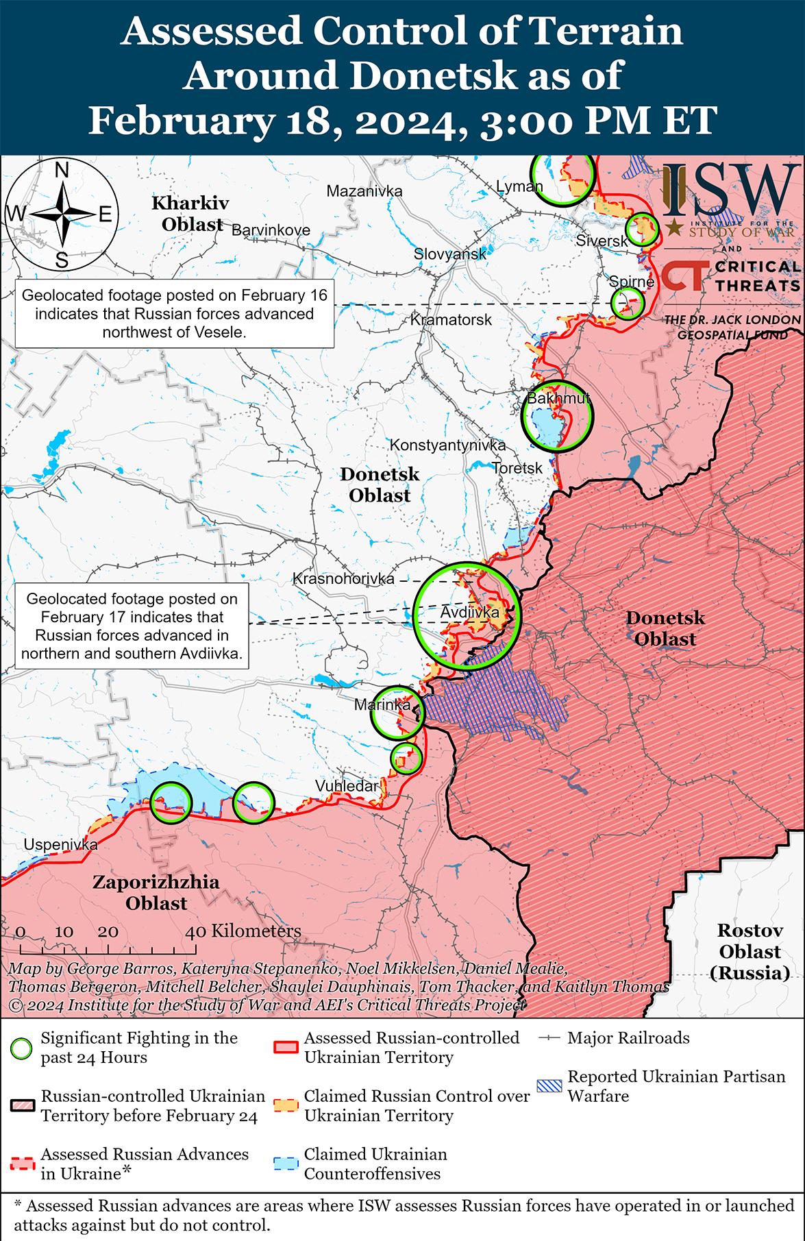 Украинские силы, вероятно, смогут создать новые оборонительные рубежи недалеко от Авдеевки, что, вероятно, приведет к кульминации российского наступления на этом направлении. 18 февраля Министерство обороны России заявило, что подразделения российской группировки войск «Центр» полностью захватили Авдеевку, продвинувшись в этом районе на 8,6 километра в глубину, и что российские войска продолжают наступательные действия по захвату дополнительных территорий в Донецкой области. [1] 18 февраля несколько российских военных блогеров заявили, что украинским силам не хватает хорошо подготовленных оборонительных позиций к западу от Авдеевки и что российские войска смогут продвинуться дальше вглубь западной части Донецкой области за «паникующими» и «дезорганизованными» украинскими силами, отступающими из Авдеевки. [2] ISW до сих пор не обнаружил кадров беспорядочного вывода войск украинцев в поддержку этих российских заявлений и ожидает увидеть такие кадры, если вывод войск был беспорядочным в больших масштабах, учитывая нормальную схему российских источников, имеющих доступ к таким материалам. Один российский военный блогер заявил, что масштабный коллапс Авдеевского фронта «маловероятен», поскольку украинские силы отходят на подготовленные оборонительные рубежи, указывая, однако, что российское понимание (или представление) украинских оборонительных возможностей на этом участке фронта отличается от источника к источнику. [3]